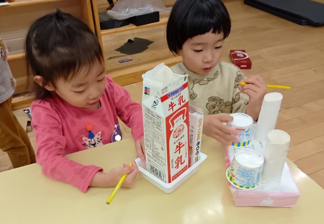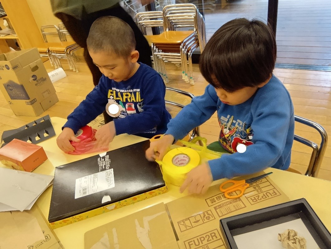 ご家庭からの協力もあり様々な廃材が揃う中、お菓子の空き箱が人気を博し「これ食べたことある!」「これ好きだから使いたい!」と友だちとの会話が広がったり、自分の気持ちを伝えようとしたりする姿も見られました。中でも5歳児は製作イメージが湧き出てくるようで10個以上の作品を次々に作り出す子もいれば一つの作品をより忠実に再現するなどの姿がありました。