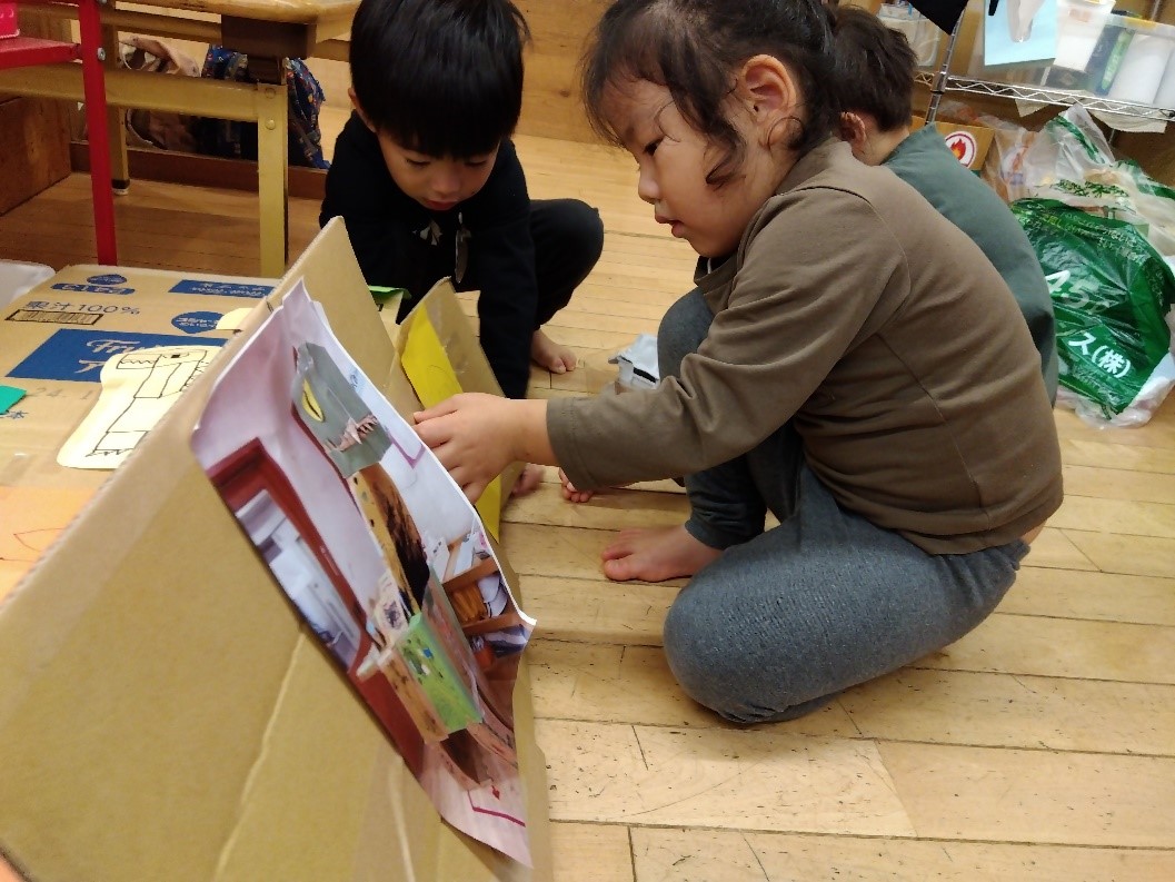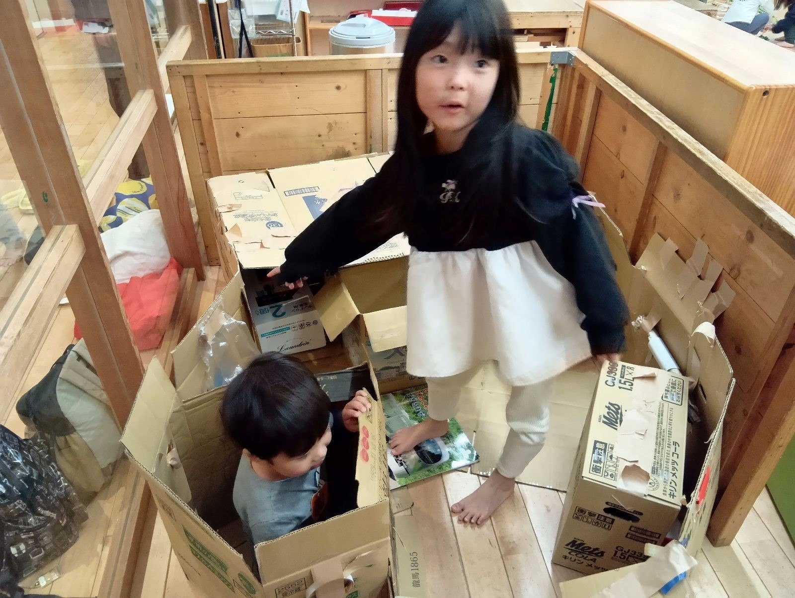 他にも職員が段ボールを広げ大きな空間を作ると、興味をもった子どもが集まり、家づくりが始まりました。自分の家には何がある、これが足りない、あれが必要だと様々な意見が飛び交います。それだけでなく、作るものが決まった途端「僕はシャワーを作るよ」、「冷蔵庫が必要だから作ってくるね」と自然に役割分担が始まりました。気づけばあっという間に大きな家の完成です。出来上がった空間は今も子どもたちのごっこ遊びの一つとなっています。