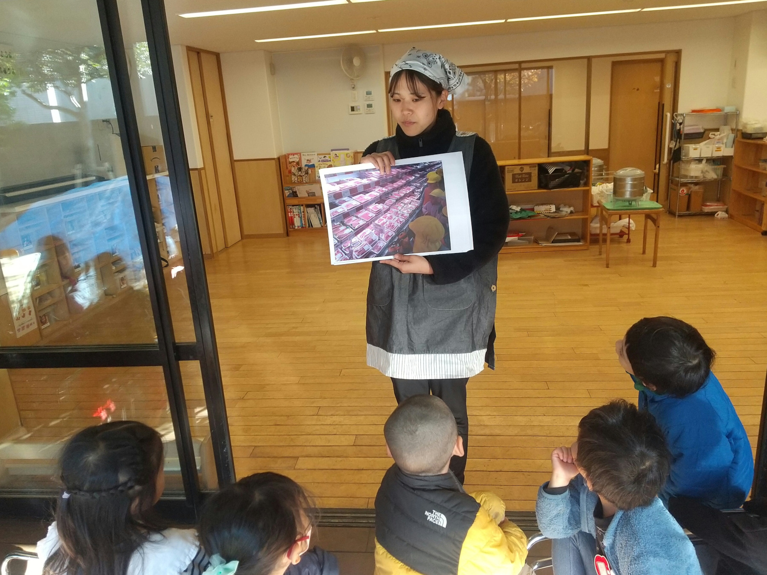 中目黒どろんこ保育園では鶏を飼育していないため、絵本を読んで生き物が食卓に並ぶまでのイメージを掴んでもらい、実際に鶏が絞められているところは写真を使って説明しました。