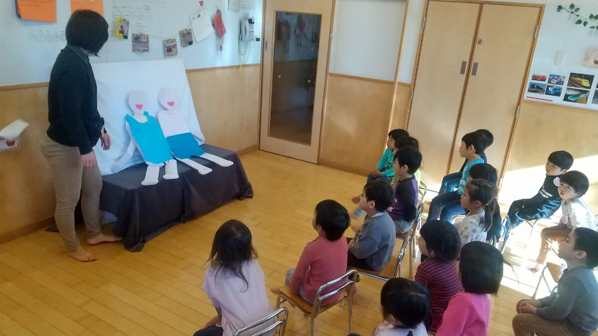 看護師の話によく耳を傾け、問いかけにも考えて答える姿が見られました。友だちを意識するようになり、自分と相手の体のちがいにも気づく年齢です。性教育の話をすることで、より自分の体を大切にし、友だちとの関わり方も考えられるようになっています。