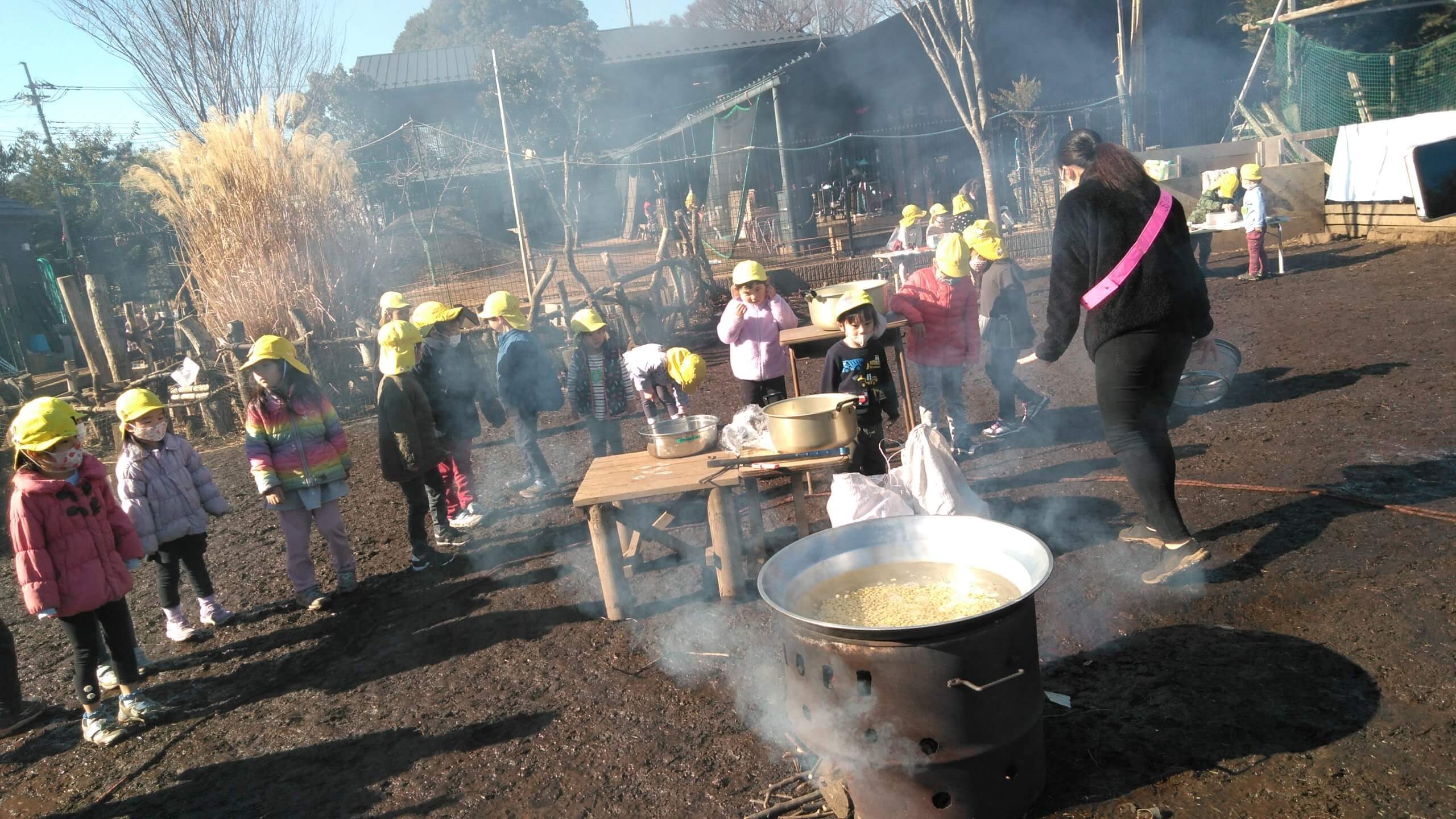 翌日になると、大豆がたっぷりと水を吸い込んでいるので柔らかい状態になります。園庭に出て、たき火に窯を置き、大豆を煮込んでいく過程を観察しました。指でつまみ、簡単に潰れる状態になると事前準備が整います。子どもたちは大豆の煮込まれた香りを直接かぐことで、大豆の変化を楽しみました。