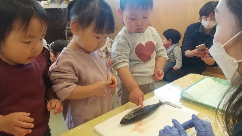 「いのちをいただく」ということが、子どもたちにも伝わるように「魚(アジ)の解体ショー」を行いました。 伝え方や伝える内容も年齢ごとに異なるため、クラス別に実施することで、発する言葉や見る視点なども様々でした。 はじめに行った0歳・1歳児クラスでは、初めて解体を見る子も多く、興味津々で見る子、ドキドキしながら保育者の近くで見る子、包丁で切る様子を見て泣いてしまう姿など様々でした。