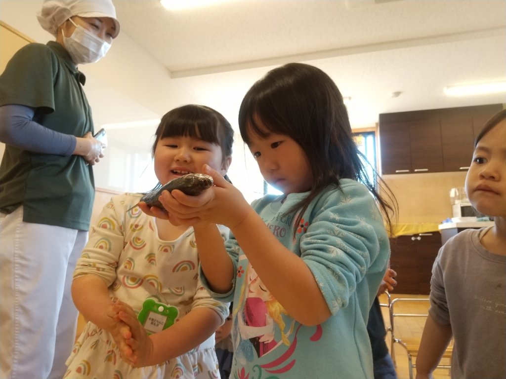 2歳・3歳児クラスでは「血がでてる」と魚の「血」に反応する子が多くいました。そのなかで「かわいそう」「いたそう」という言葉も出てきましたが、最後には「たべたい」「どうやって食べるの?」という話題にもなり、短い時間のなかでも、様々なことを感じていることを実感できました。