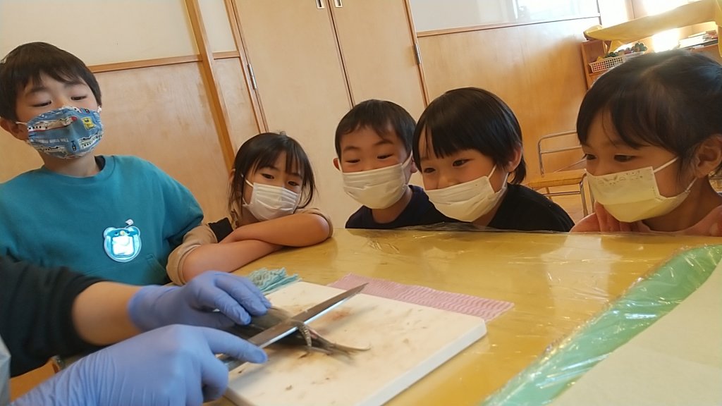 4歳・5歳児クラスでは以前に見たことを覚えている子も多く、捌く順序や魚の部位を保育者と一緒に言葉にする姿がありました。「かわいそう」という言葉も出てきましたが、それでも魚は食べたい。では、どうしたらよいか。という話にもなり、「残さず食べる」「いただきますをちゃんと言う」など、「いのちをいただくこと」に対して考える良い機会になったと思います。