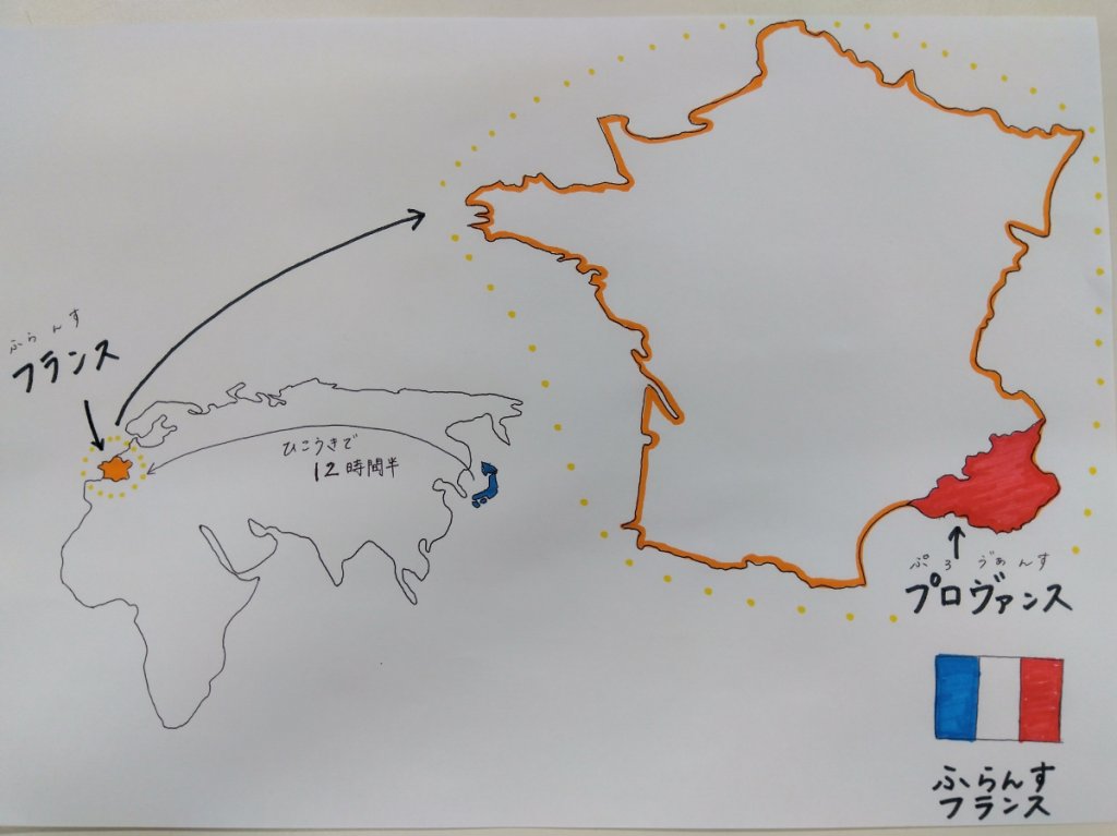 食育活動の前日に、地球儀や写真を用意し、南フランス・プロヴァンス地方に伝わる郷土料理であることを子どもたちに話しました。街並みの写真もあり、子どもたちも興味深く見て、異国の雰囲気を感じとっていました。