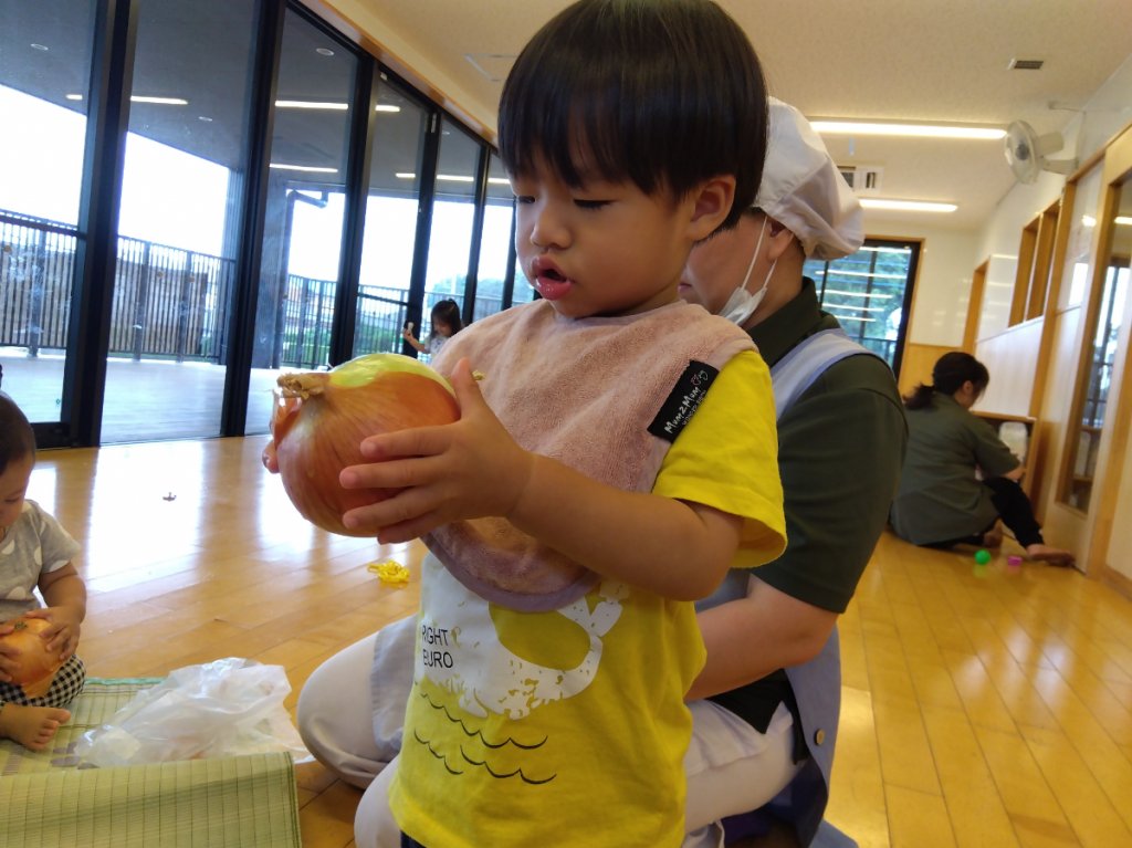 4歳児は洗った野菜を一口サイズにちぎり、5歳児クラスは包丁で野菜を切っていきました。玉ねぎを1枚1枚にちぎる作業では、「目がいたい」と目を赤くしながらも最後までやり遂げていました。