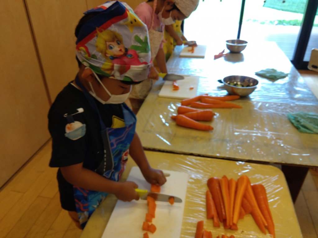 包丁を使う5歳児クラスも緊張感を持ち、「ねこの手(野菜を抑える手)」を意識しながら 丁寧に切っていました。