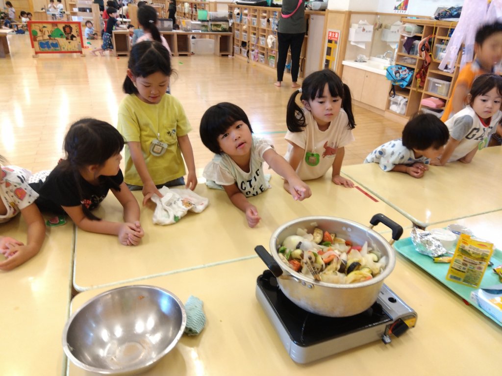 具材の準備が終わると鍋で煮込みます。煮えてくると美味しそうな匂いが保育室に漂い、遊んでいた子どもたちも集まってきました。普段よりも給食の時間を楽しみにする姿が見られました。アレンジの一つとして、今回はそう麺も入れて食べました。自分たちで作った達成感もあり、より一層美味しかったようで何度もおかわりしたり、普段は食べない野菜も進んで食べる姿も見られました。