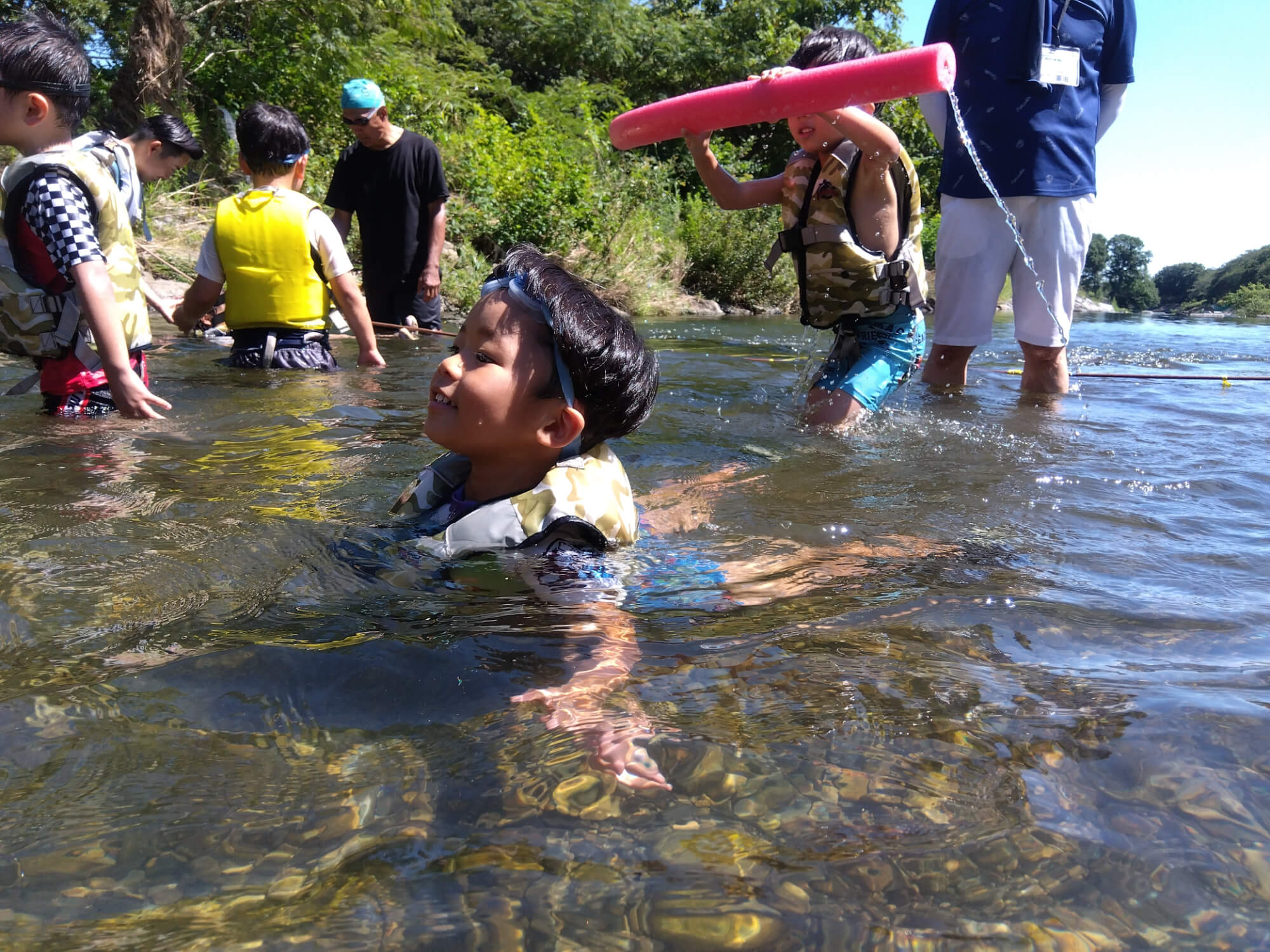 子どもたちにも自然の中で遊ぶ楽しさと共に危険も伝え、危機管理能力を高めながら実践しています。ライフジャケットを初めて着用する子もいるので、浮き方を伝えてから行っています。はじめは足を浮かすことを怖がる子もいますが、身体が浮くことを理解すると、上流から仰向けになって浮き、流れることを楽しむ姿があります。