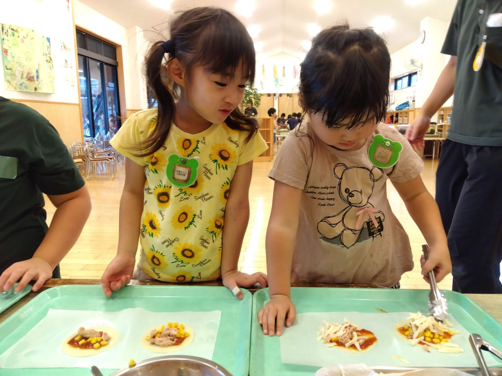 食育活動では、畑で収穫した夏野菜を使って全園児でピザづくりをしました。