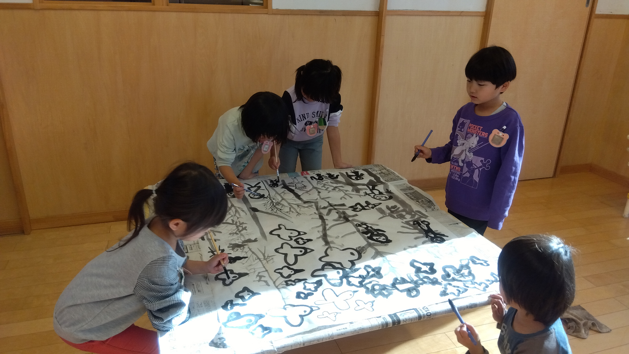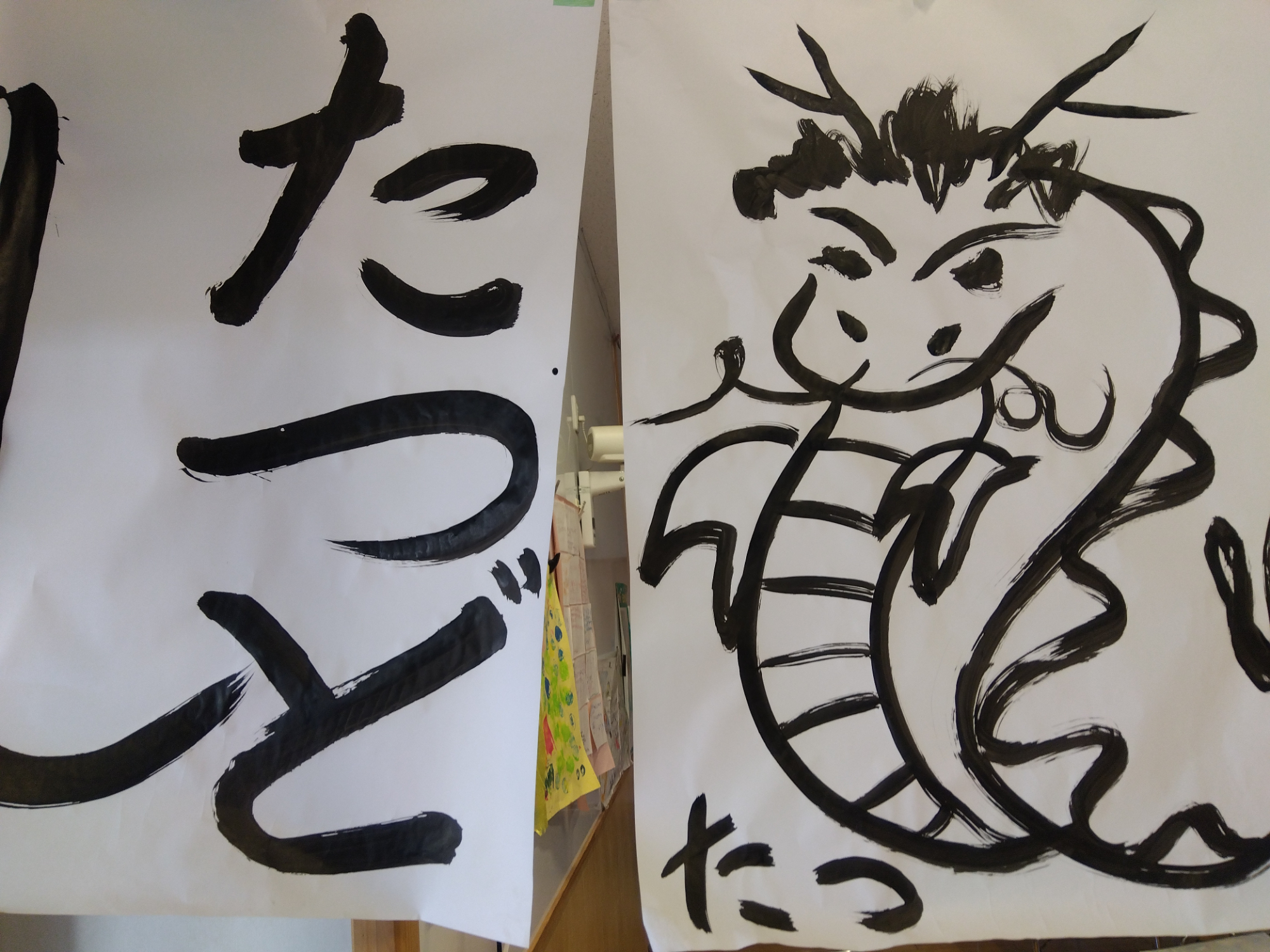 書初めや干支の「辰」を筆で描く保育者もいたことで、文字が書けない子も「やってみたい!」「あれやる!」と楽しみにしていました。