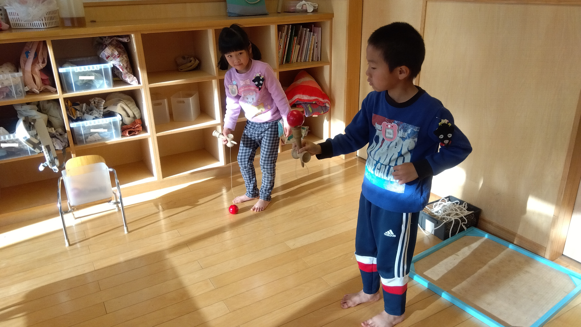 コマ回しやかさ回し、お手玉やけん玉、あやとりなどを見ると「すごい!」と夢中で見ていました。