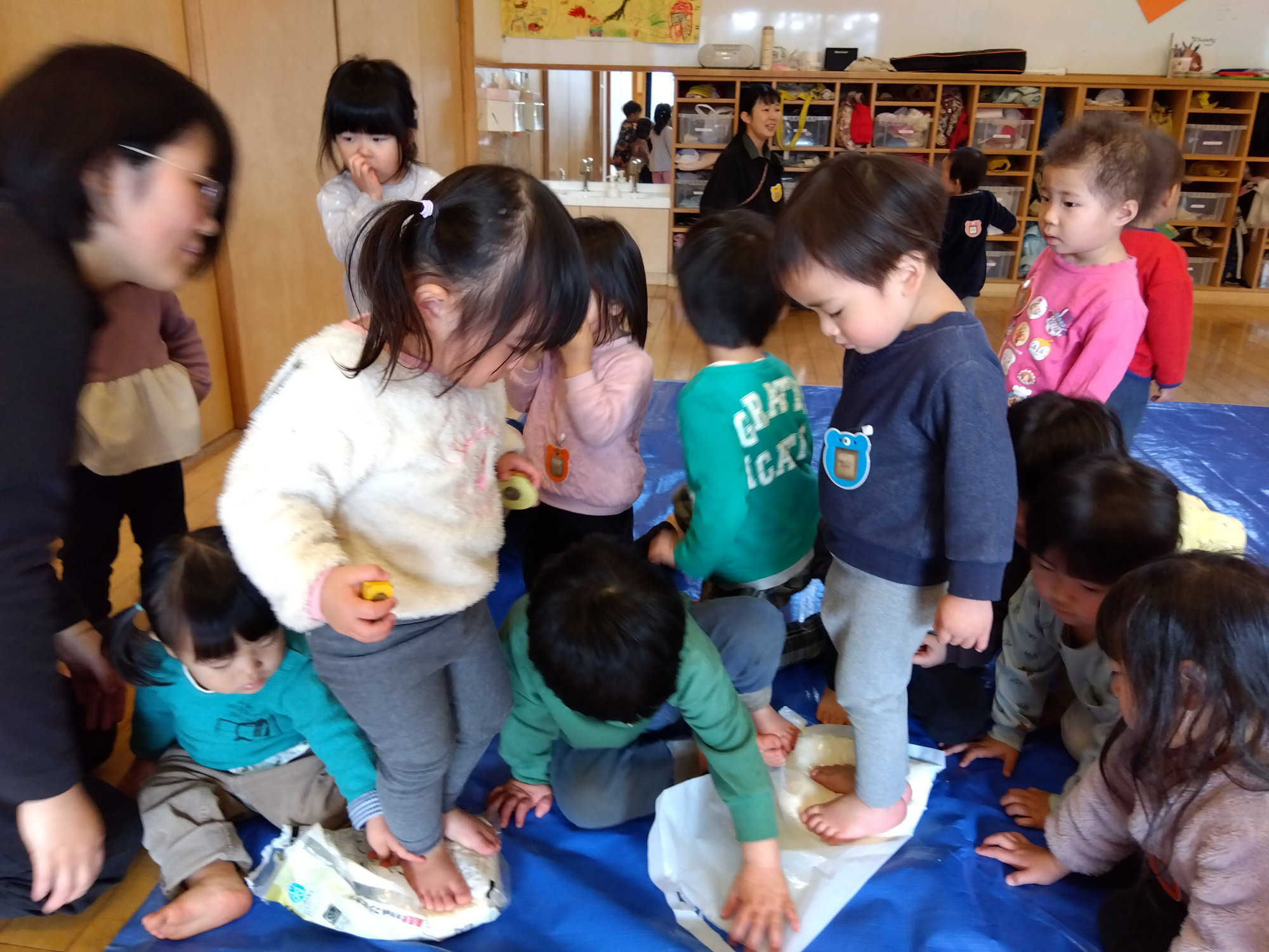 0~2歳児の生地踏みは、生地の感触の戸惑いを見せながらも「いいの?」「やわらかい」と感じたことを言葉に表しながら、楽しそうに踏む姿が見られました。