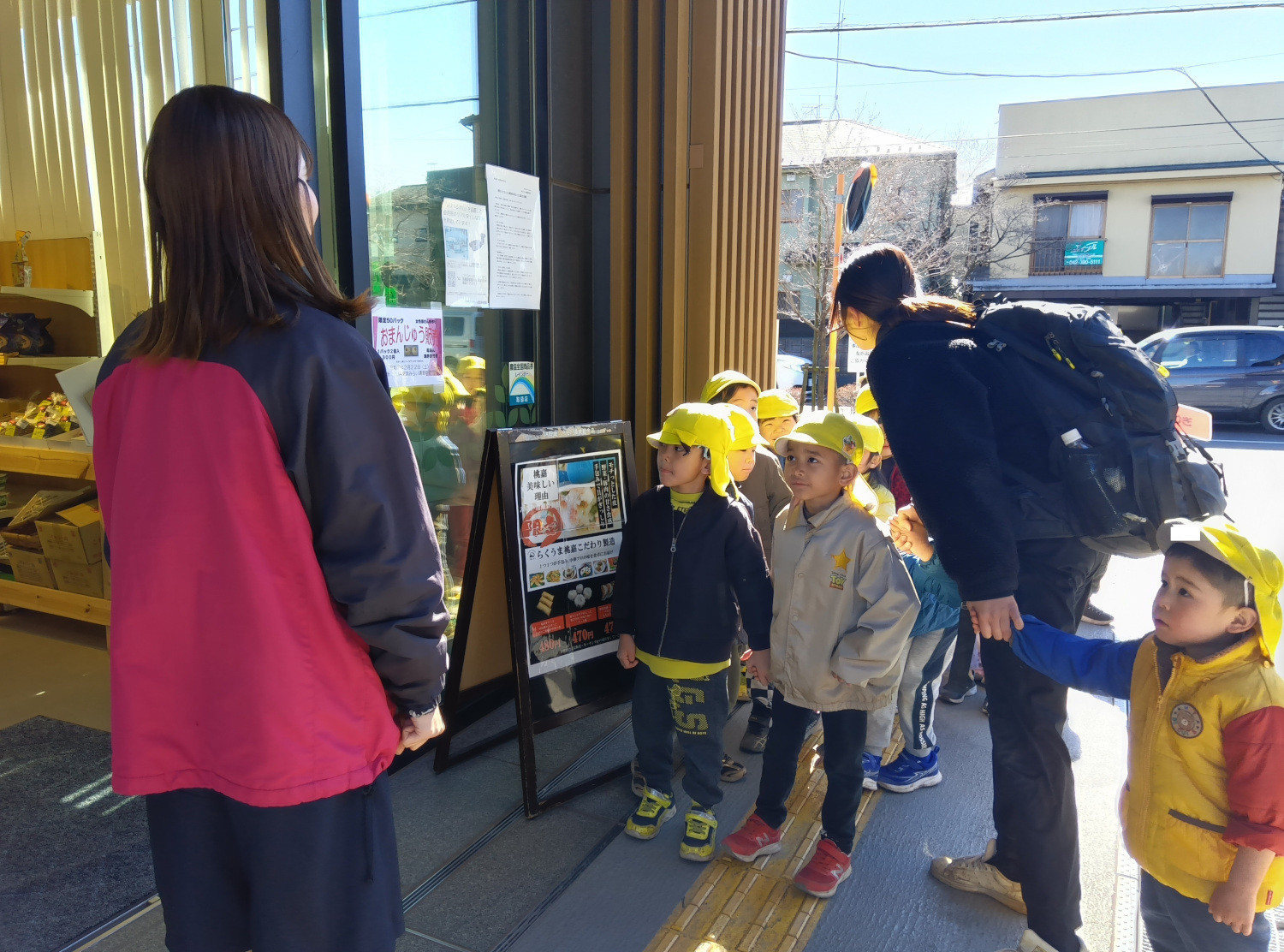 子どもたちの表情からは、わくわくと心躍る様子が見られました。現地に到着する前に「お店に入るときの約束」を確認しました。「お店ではどういう約束がある?」と保育者が聞くと「歩く!」「静かにする!」と、これまでの経験を思い出し、次々と約束事を保育者に伝える姿が見られました。