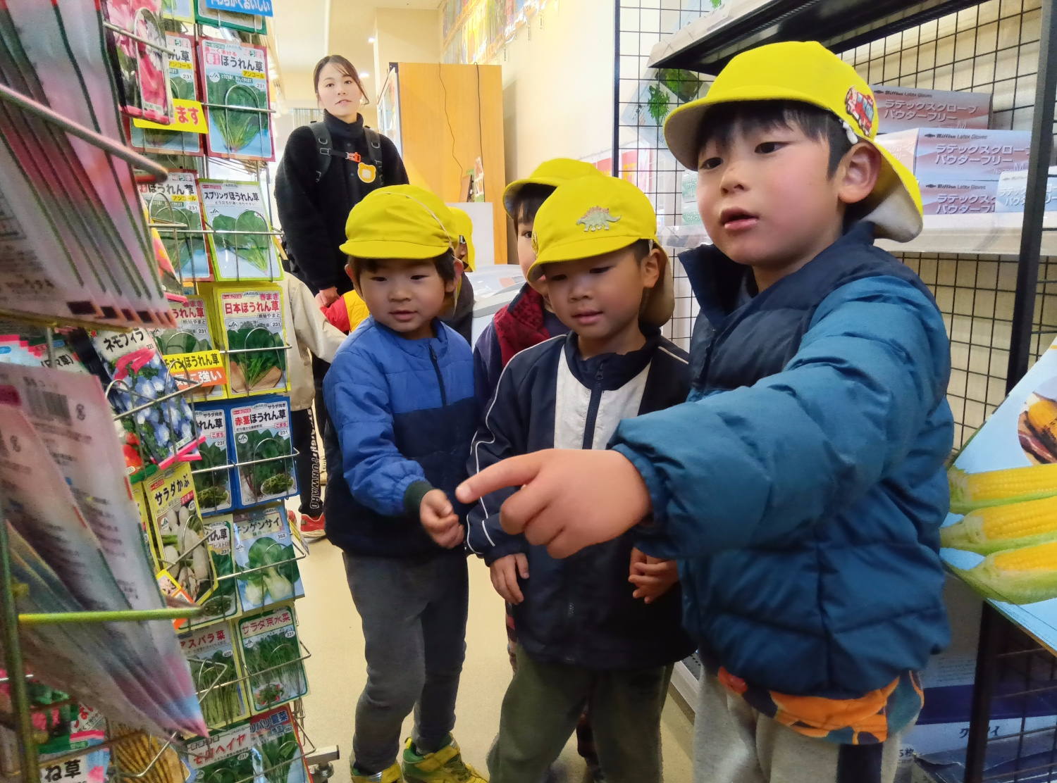 なかでも釘付けになっていた物は野菜の種コーナーです。指を差しながら「この野菜知ってる!」「これ育てたことあるよね」など袋に表示されている野菜の写真を見て、声の大きさを考えながら友だちとの会話を楽しんだり、自慢げに話したりして大いに盛り上がりました。