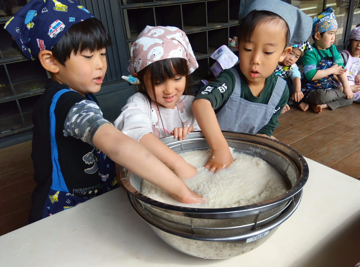 こめ組は、4キロ超えのお米を研ぎました。研いだ後の水の色やお米の硬さなどに注目しながら研ぎ進めていました。ざる・ボウルからこぼれないよう、お米がつぶれないように力を調節しながら取り組んでいました。回数を重ねると研いだ水の色が変化することに気が付き、「まだ牛乳だ」「だんだんカルピスみたいになってきた」「もう水になってる!」と身近なものに例えて友だちと共有して喜びや達成感を味わうことができました。
