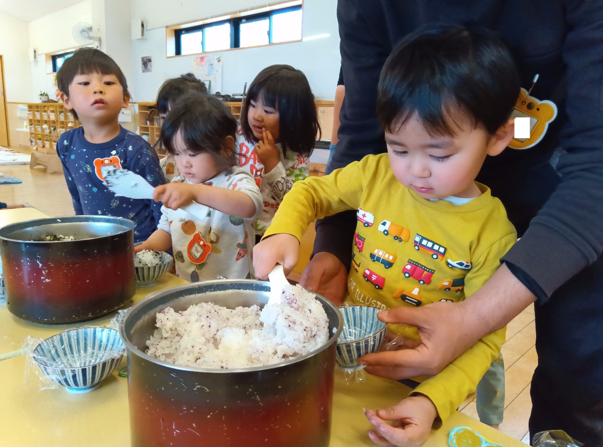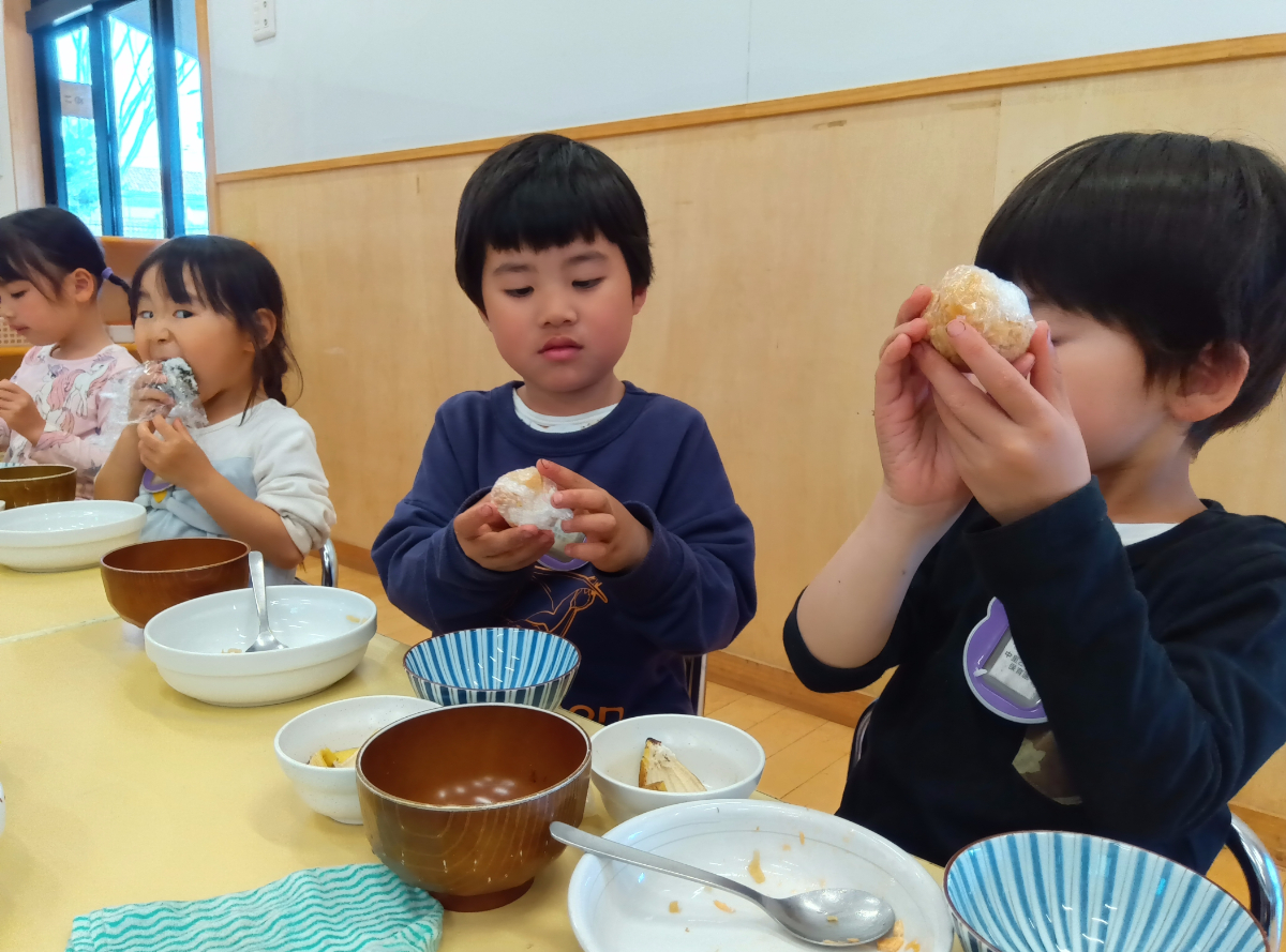 友だちとおにぎりの大きさを比べたり、違うおにぎりを選んでいるのを見ておかわりをしたりして、楽しみながら食べ進めていました。普段よりも多い約8.5㎏のご飯を完食しました。