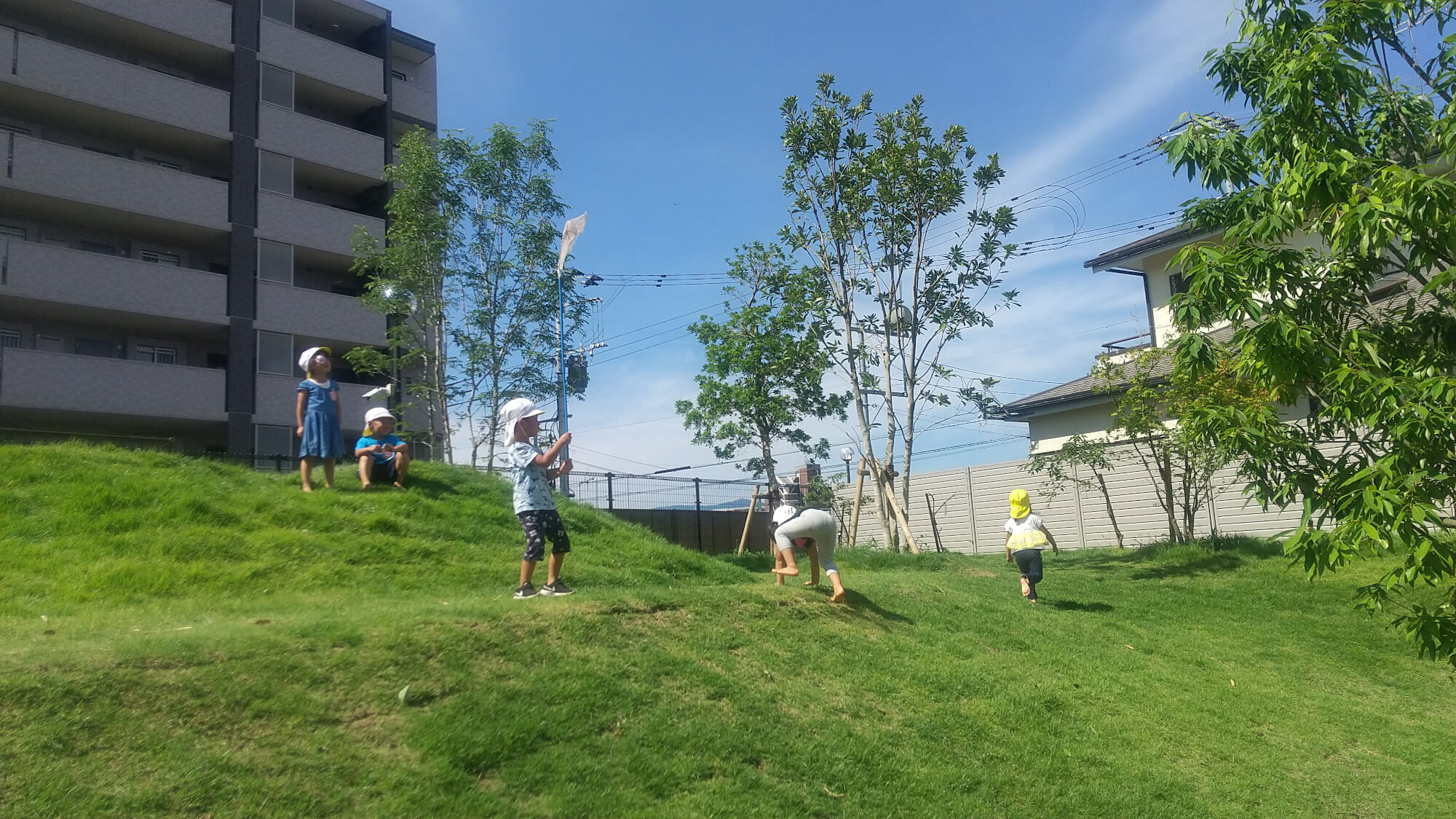 自然豊かな園庭が自慢の自園では、子ども達が元気に築山を駆け上がり山のてっぺんまでかけっこしたり、蝉やトンボなど虫捕りに夢中になったりして遊んでいます。