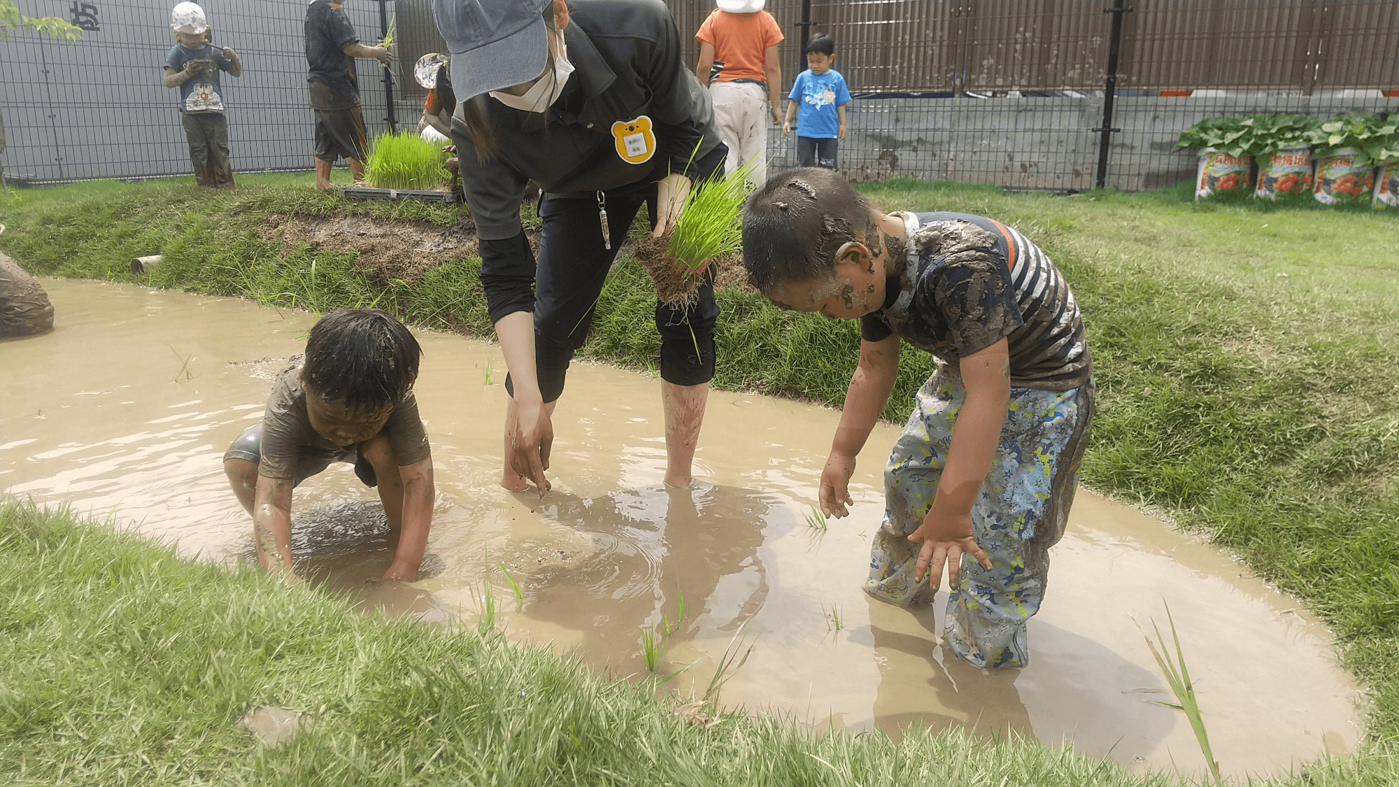 6月には初めて田植えにも挑戦。お米から発芽させた苗を、全身どろんこになりながら一生懸命植えました。毎日、田んぼを覗き込み観察している子ども達。秋の収穫を今から楽しみにしています。