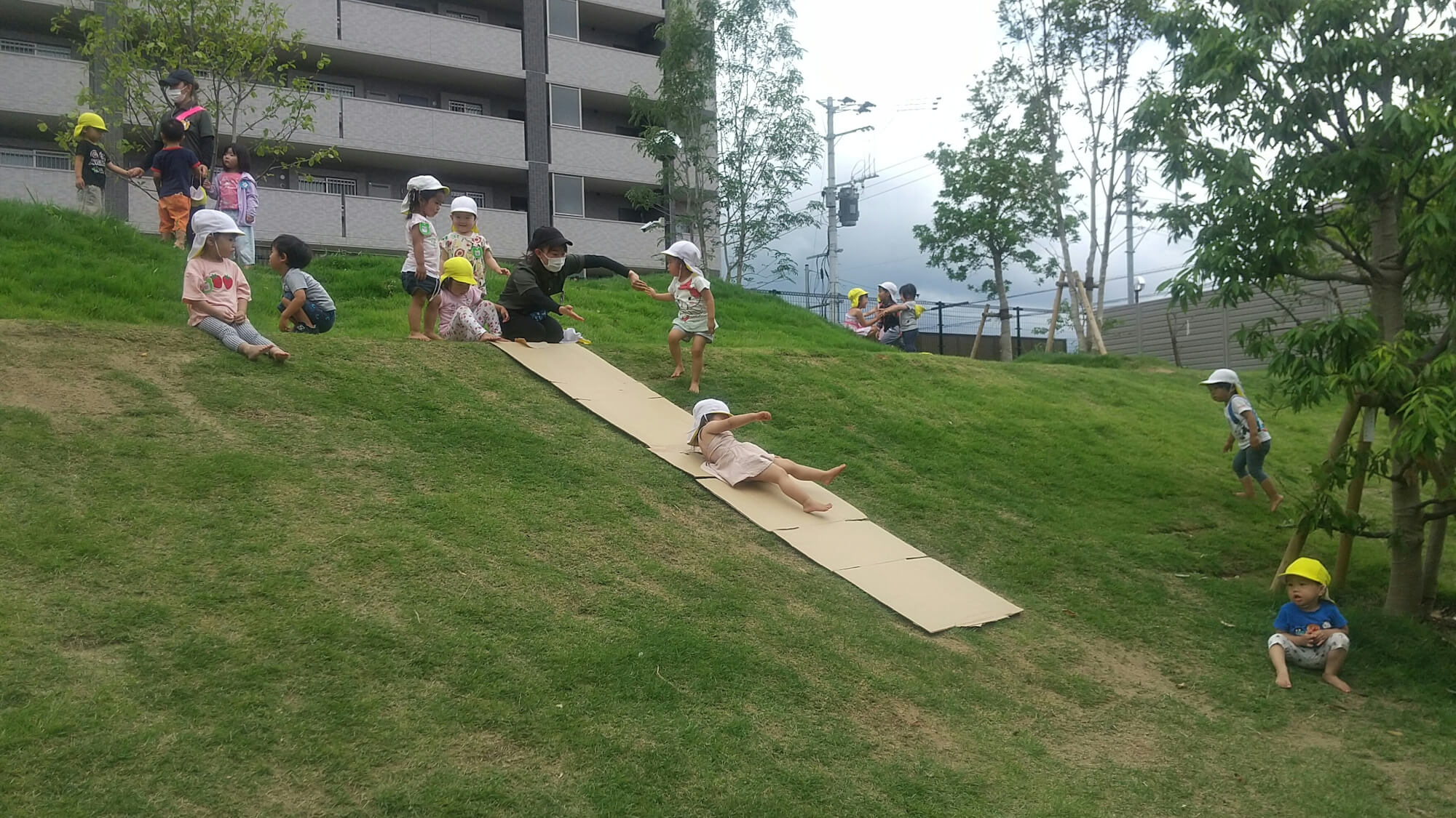 山の斜面では、長い段ボール滑り台が完成。キャーキャー言いながら何度も、何度も繰り返し滑っています。大人が滑っても楽しいので、ぜひ一度体験してみませんか。