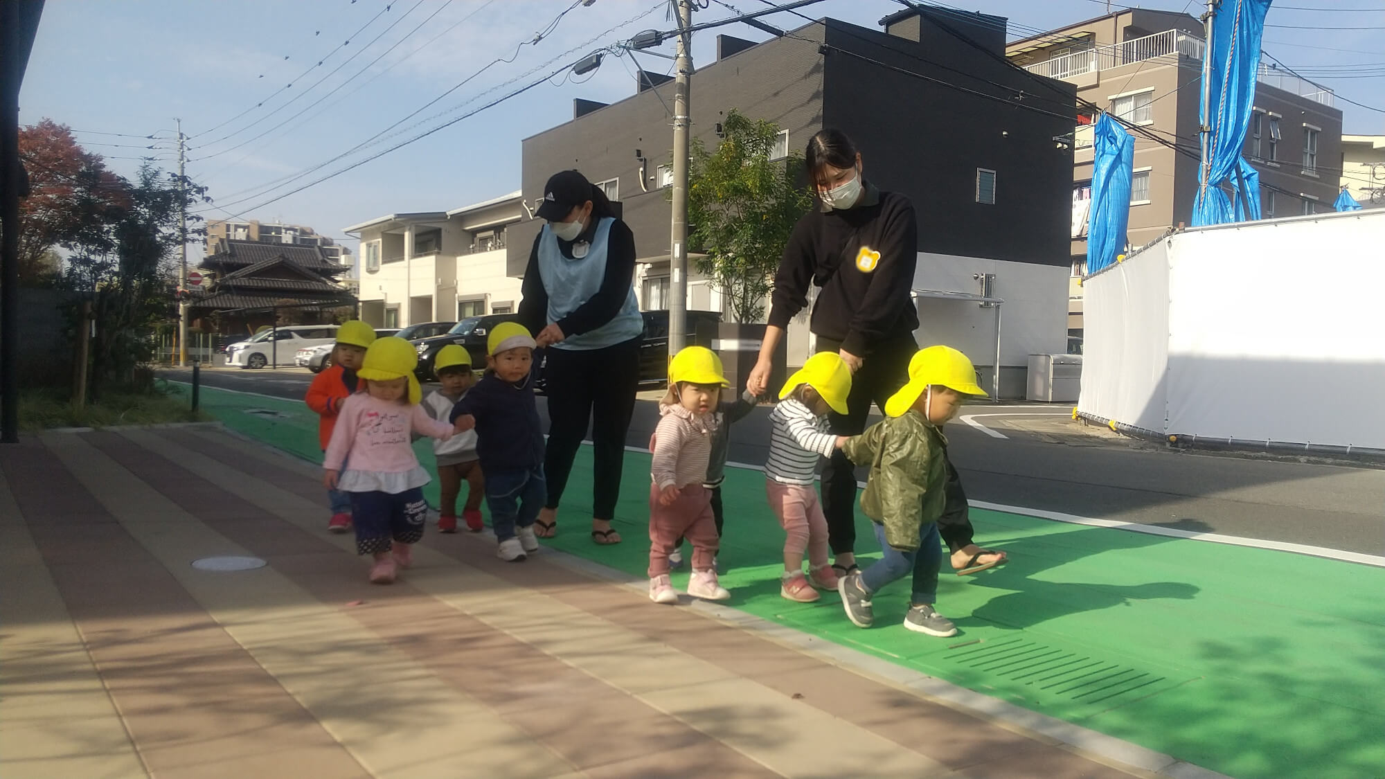 三筑どろんこ保育園では、園の周辺を散策したり、公園へ行ったりと、散歩に行く機会を多く取り入れています。すれ違う地域の方に「おはようございます!」と元気いっぱい挨拶したり、手を振ってちょっとした会話を交わし交流したり、自然に触れ季節を感じながらお散歩を楽しんでいます。幼児クラスだけでなく、乳児クラスの子どもたちも友だちや先生と一緒に手を繋いで少しずつ距離を伸ばし歩けるようになってきました。