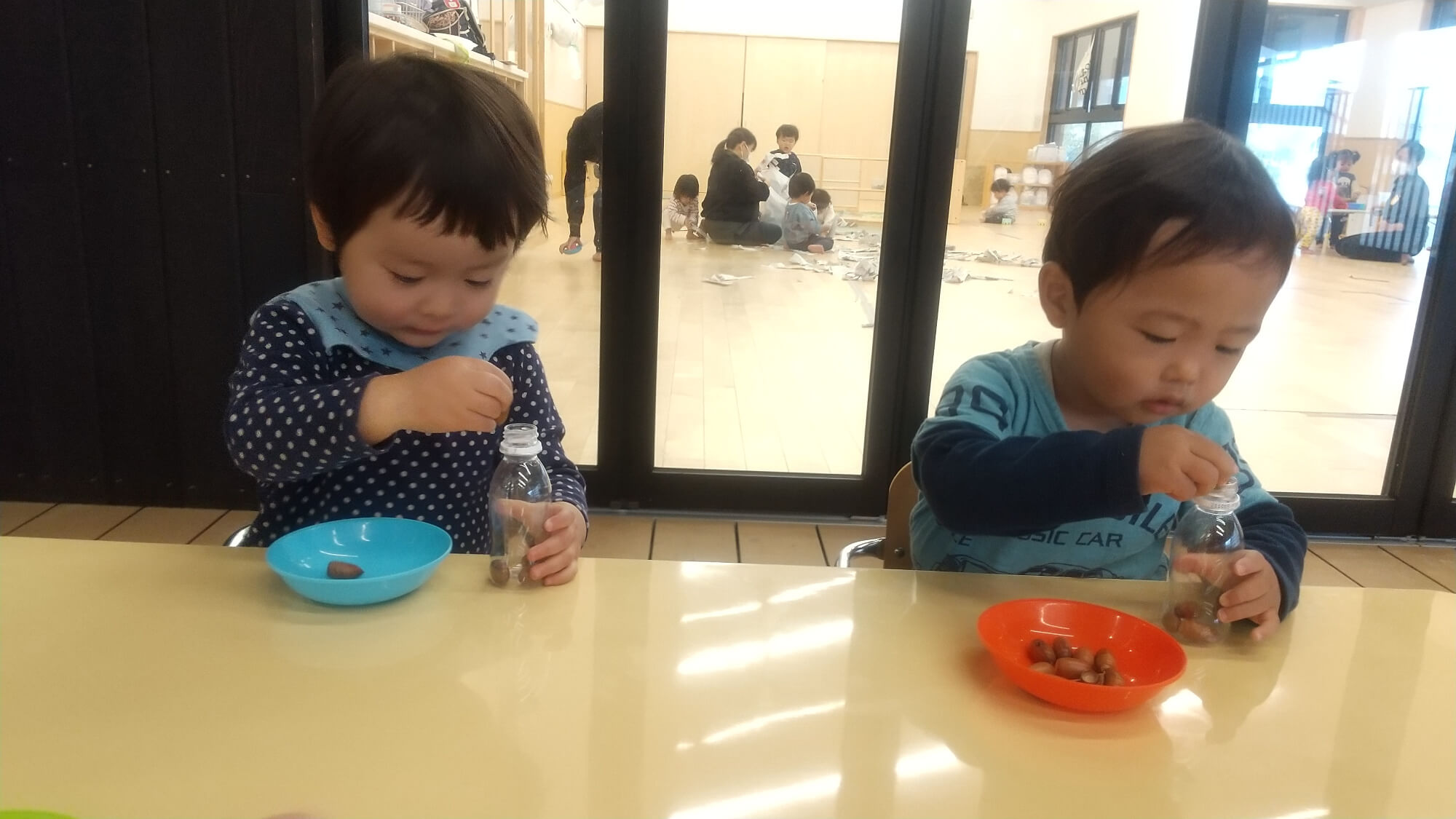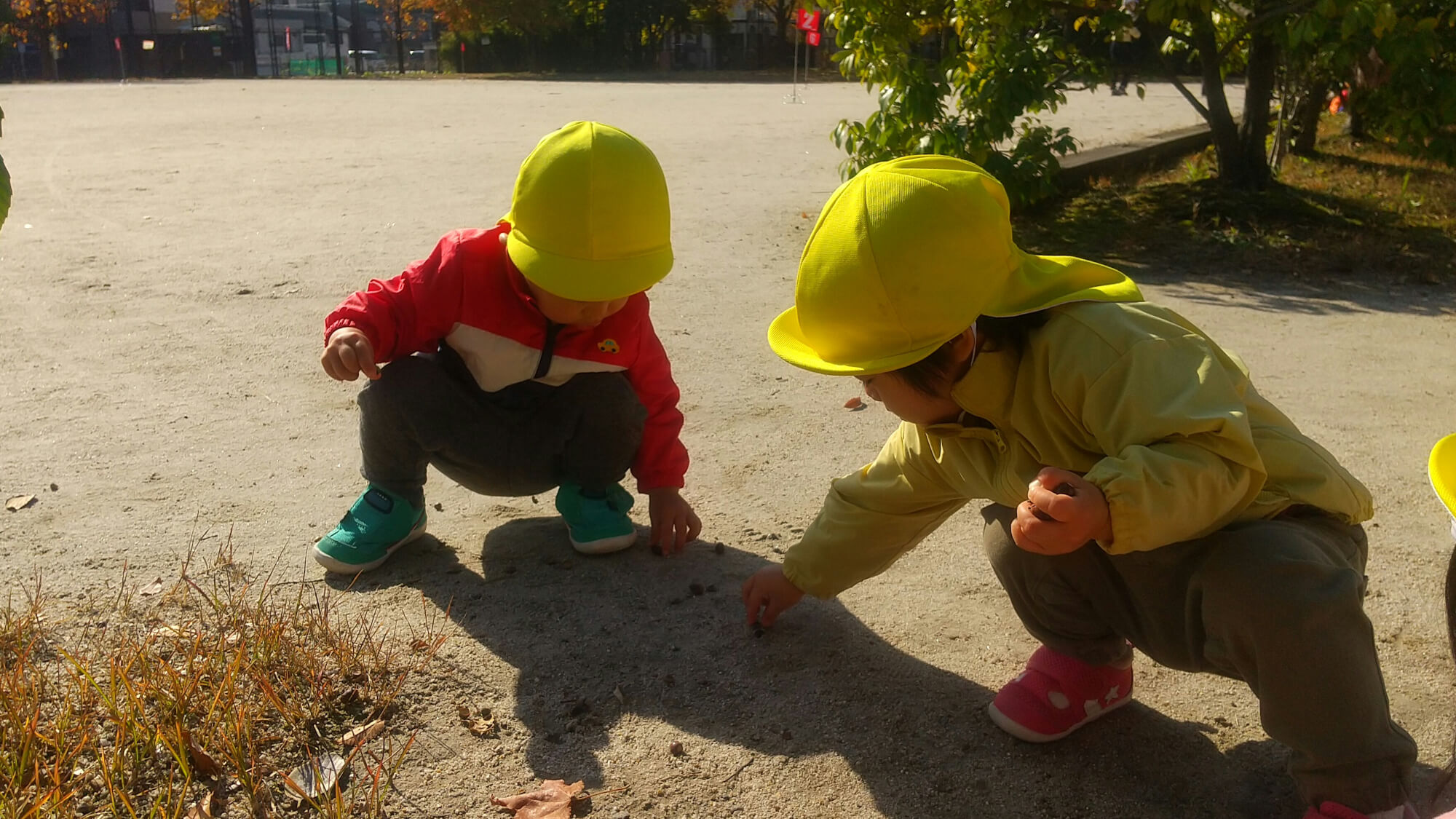 先日、諸岡中央公園にお散歩に行った0,1歳児クラスの子どもたち。公園内を散策していると、どんぐりが落ちているのを発見。「あっ、どんぐり!」「いっぱいねー」とみんな大喜びで、手に持ちきれなくなるほどたくさんのどんぐりを夢中になって拾っていました。