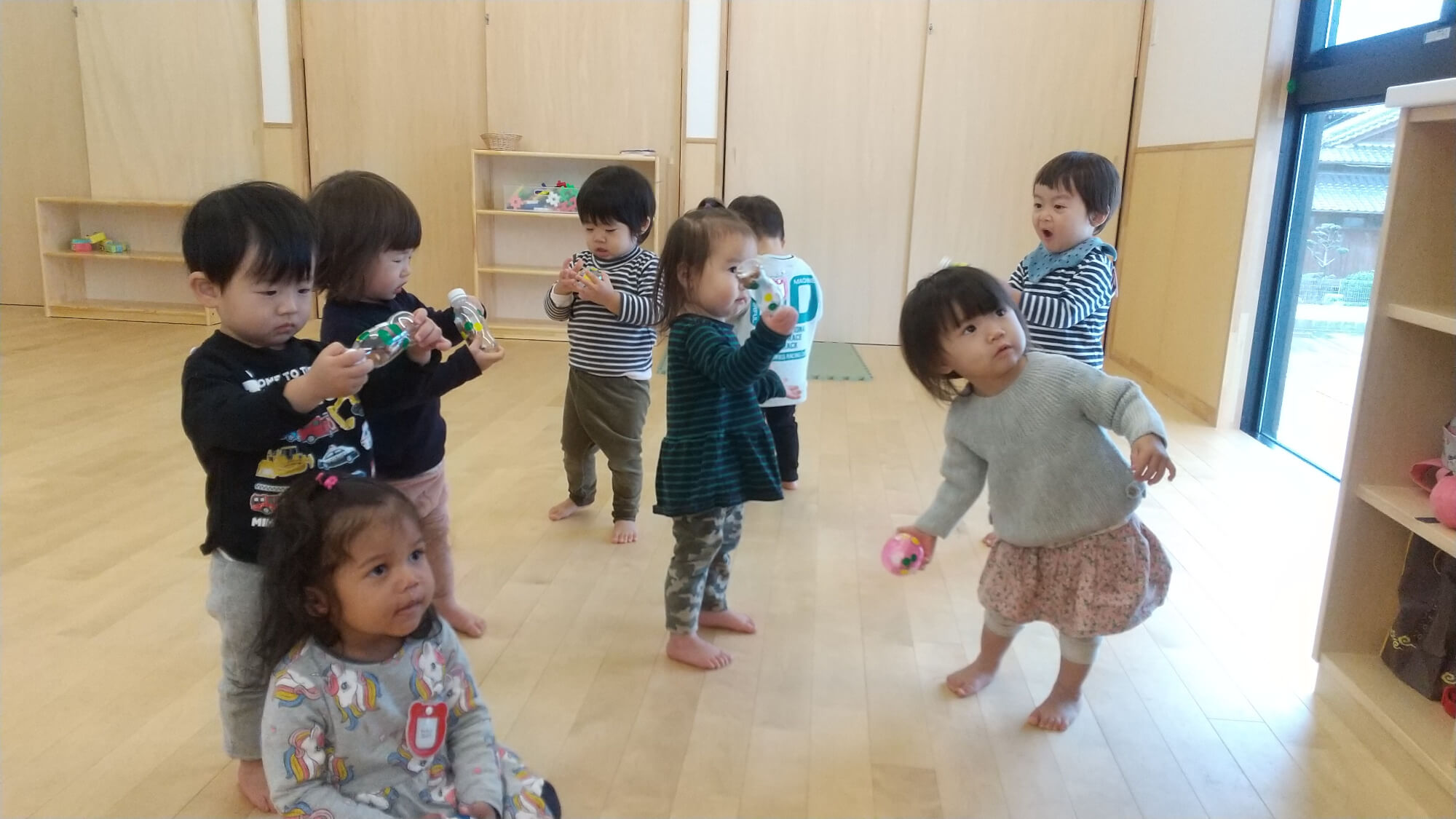 そして、自分で作ったどんぐりのマラカスを使ってミニ演奏会の始まりです!保育士のピアノに合わせて体を揺らし、マラカスを振って演奏会を楽しみました。