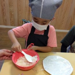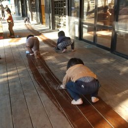 園庭の隅では、虫探しが行われていました。「草の下に何かいないかな?」「そっと見ないと逃げちゃうよ!」と小さな声で会話をしながら、そっと草をかき分け夢中になって探していました。虫探しが得意な子は「こっちの方にいっぱいいるよ」と虫の棲み処を友だちに教えてあげる姿も見られました。そんな姿を見て、1歳児の小さなお友だちも真似して草を掻き分け虫探しを始めていました。上手に見つけられるかな?
