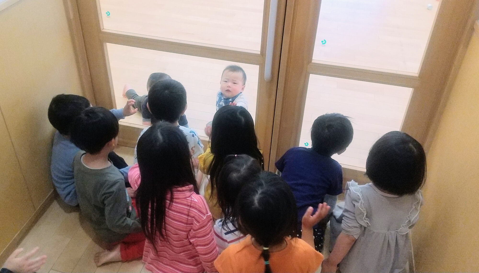 次に、園舎内の探検です。あわ組(0歳児)のお部屋をのぞいて小さな赤ちゃんを見つけると思わず「かわいい」という声があがり、手を振ったり、「いない、いない、ばぁ」とあやしてくれたりしました。