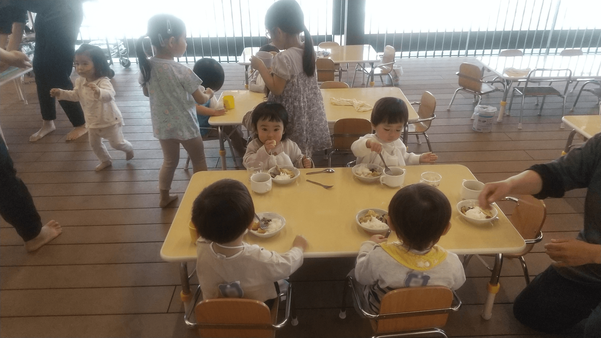 乳児クラスはまだまだ不安いっぱいで涙する子が多いのですが、少しずつ安心できる保育士や環境を見つけ、散歩に出掛けるなどして気分転換を図りながら過ごしています。しかし、みんなが大好きな給食の時間になると、さっきまで泣いていた子もすっかり泣き止んで美味しい給食をモリモリ食べています。中にはおかわりをする子もいます。