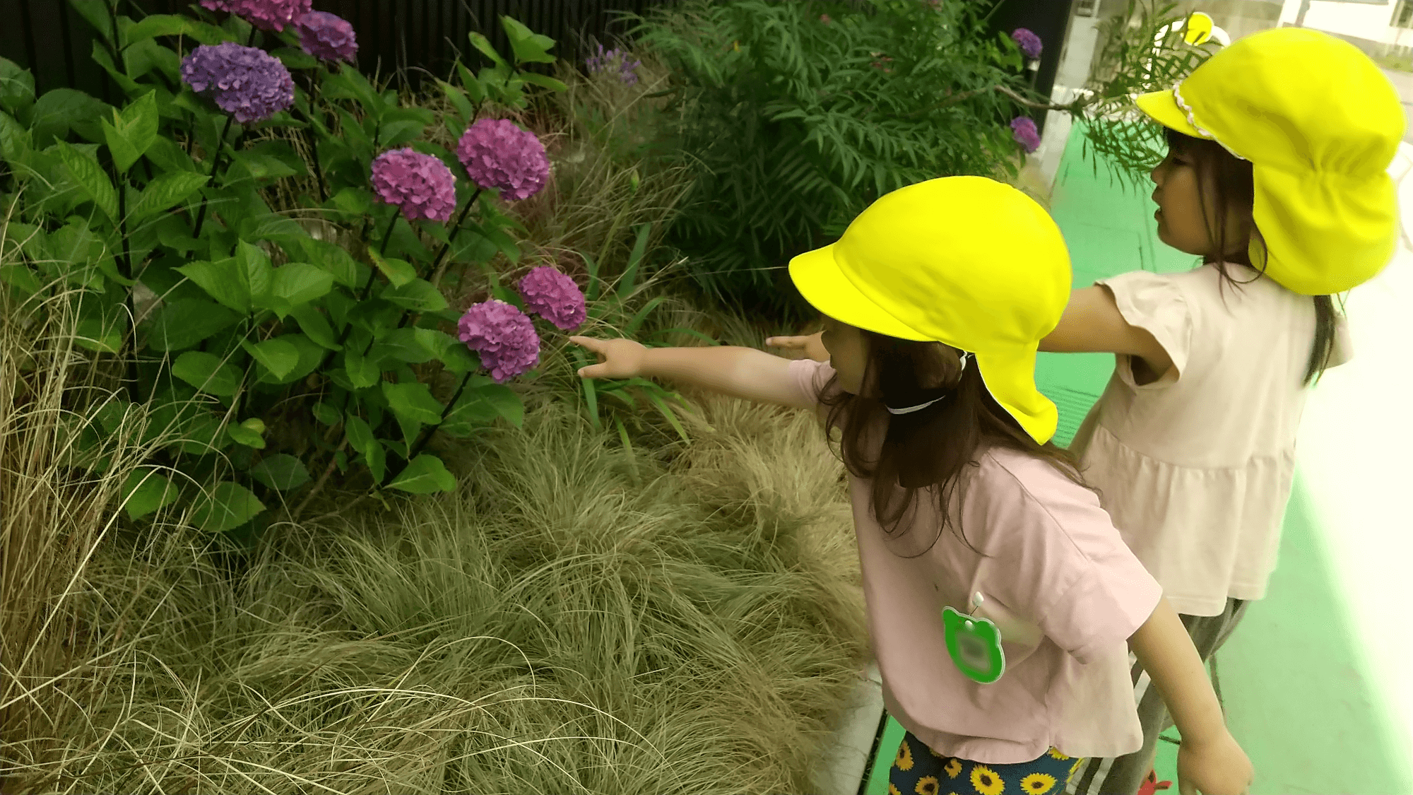 梅雨時期ならではの紫陽花を見つけると、咲いている場所によって大きさの違いや色の違いに気付き、そっと触れてみたり匂いを嗅いでみたり、自然に触れ楽しんでいます。