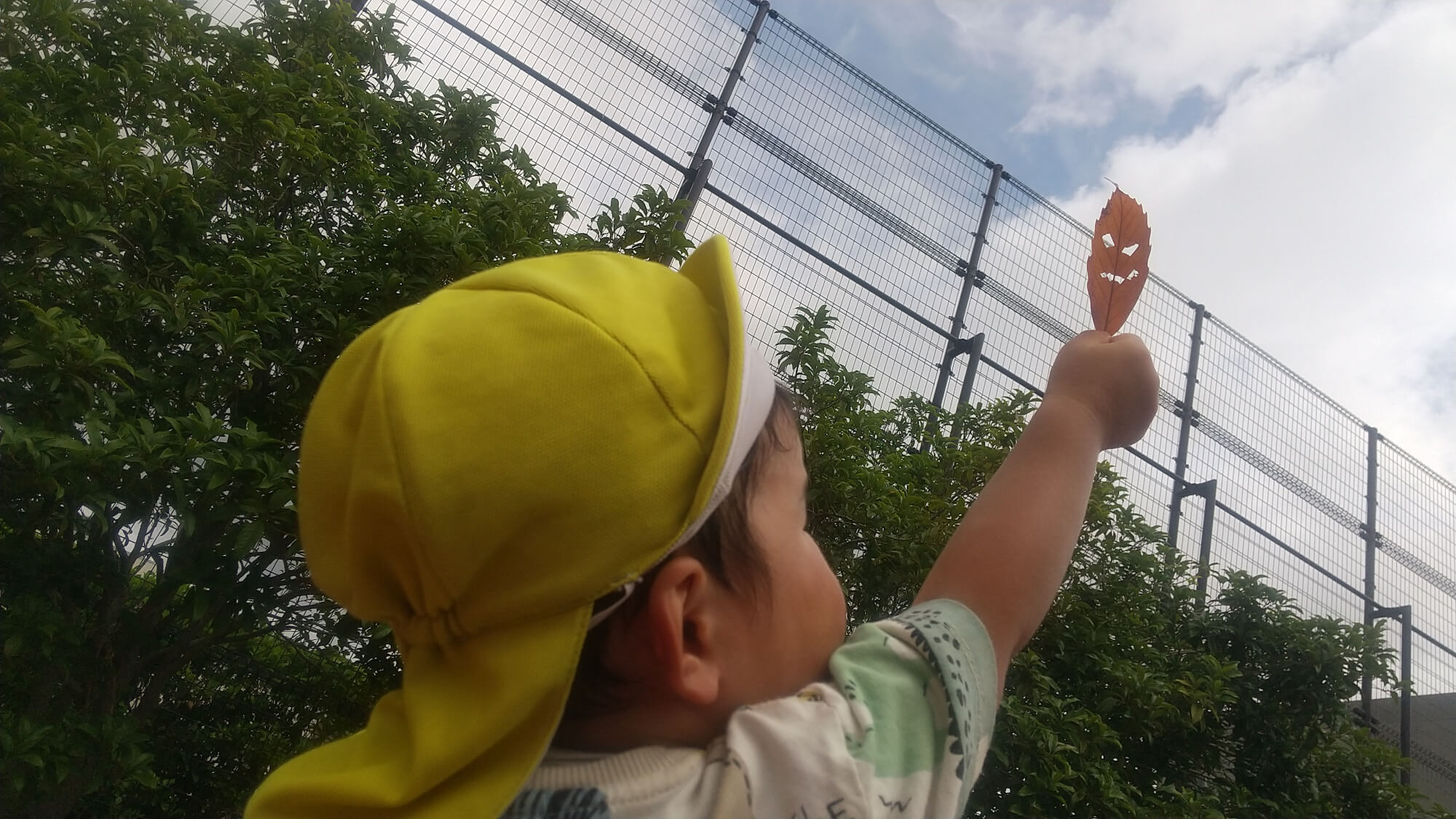 公園では、落ち葉を拾い、保育者に作ってもらった葉っぱのおばけを太陽に透かして「おばけだぞ~」とおばけごっこを楽しんでいました。