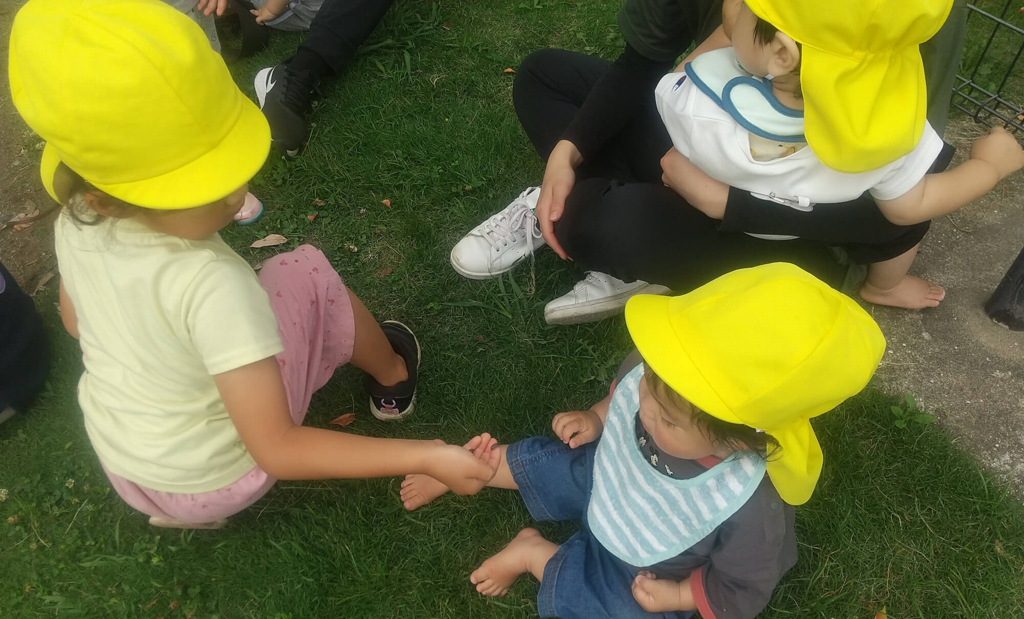 幼児クラスの子がダンゴ虫やいろいろな虫を発見すると、一緒に来ていた0歳児の子に「見せてあげるね」と(保育者に)バギーから降ろしてもらい、怖がらないように優しくそっと見せていました。