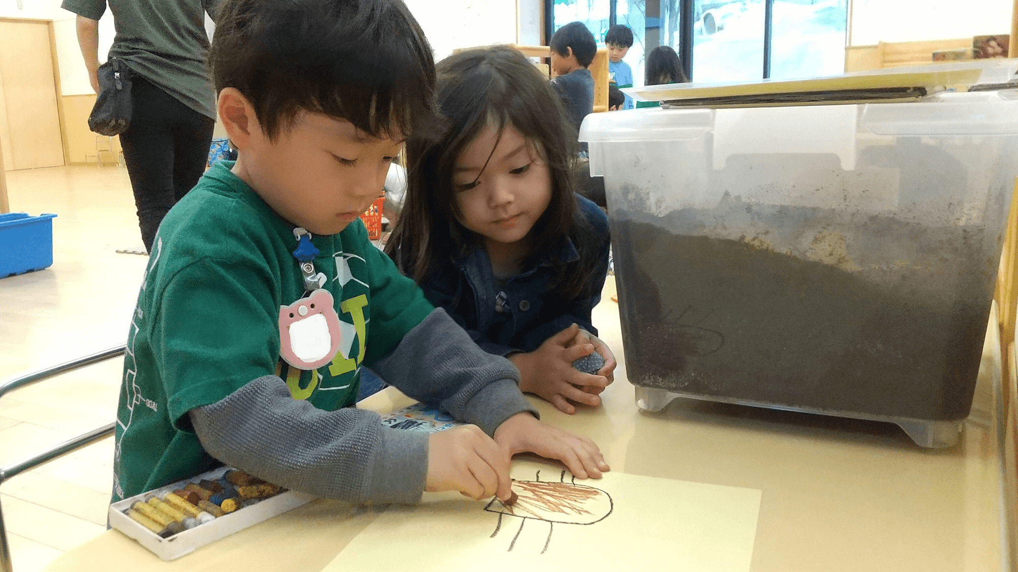 みんなでどうやって育てようかワクワクしながら相談し、まずはカブトムシの家の看板を作ることにしました。成虫になったカブトムシのことを考えながら丁寧に描いていました。家の看板ができると「できたよ!」と2階のクラスにも知らせに来てくれるほど大喜びでした。