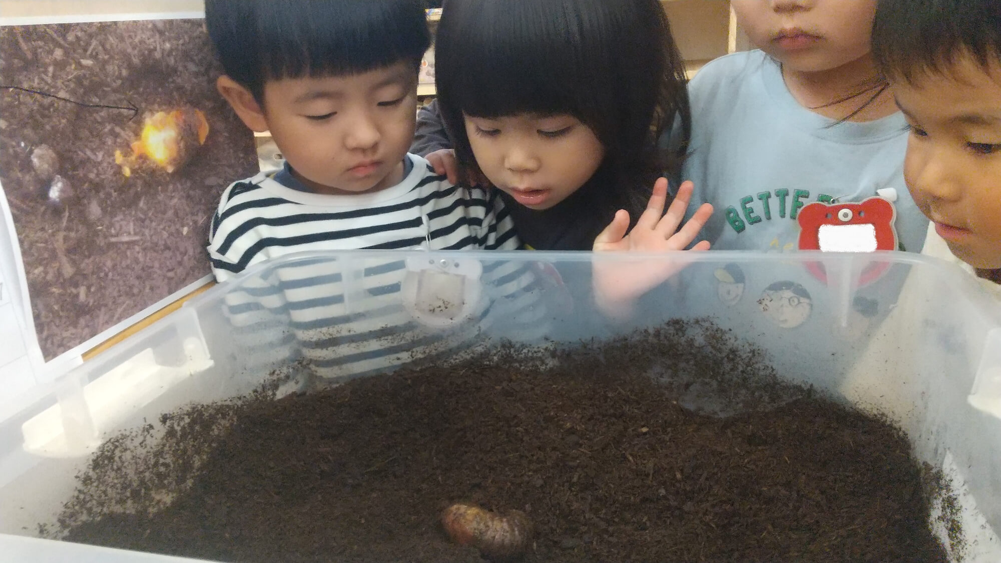 観察をしていたある日、さなぎになりかけた幼虫が土から出ていることに気づいた子どもたち。「先生見て!幼虫が見える!」とみんな興味津々で見ていました。