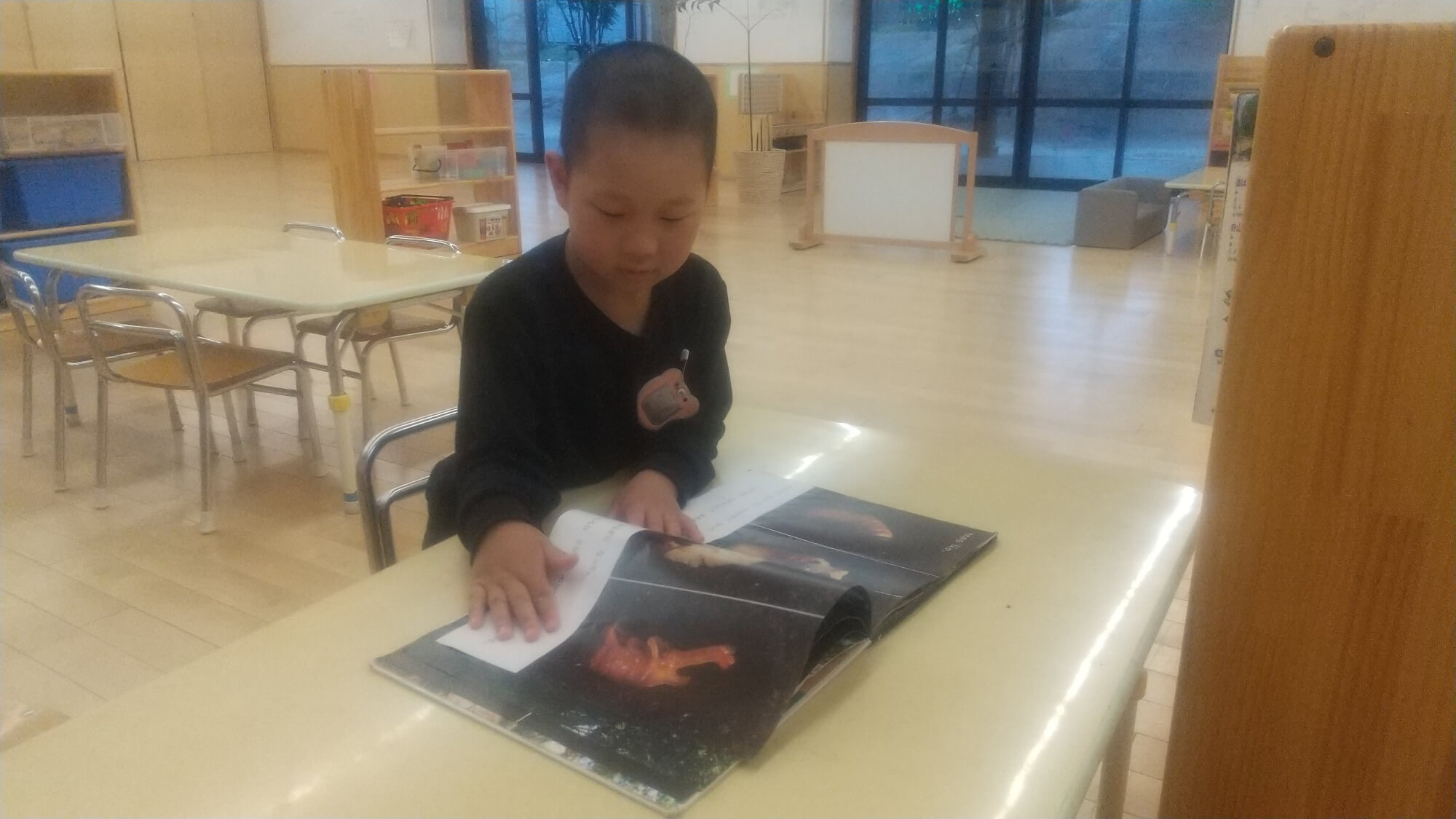 5歳児のこめ組の子どもたちが、「カブトムシのこと、ちょっと調べてみる!」と図鑑を持ってきて調べてくれました。「これはもうさなぎになってるから、もうすぐでカブトムシになるよ!」