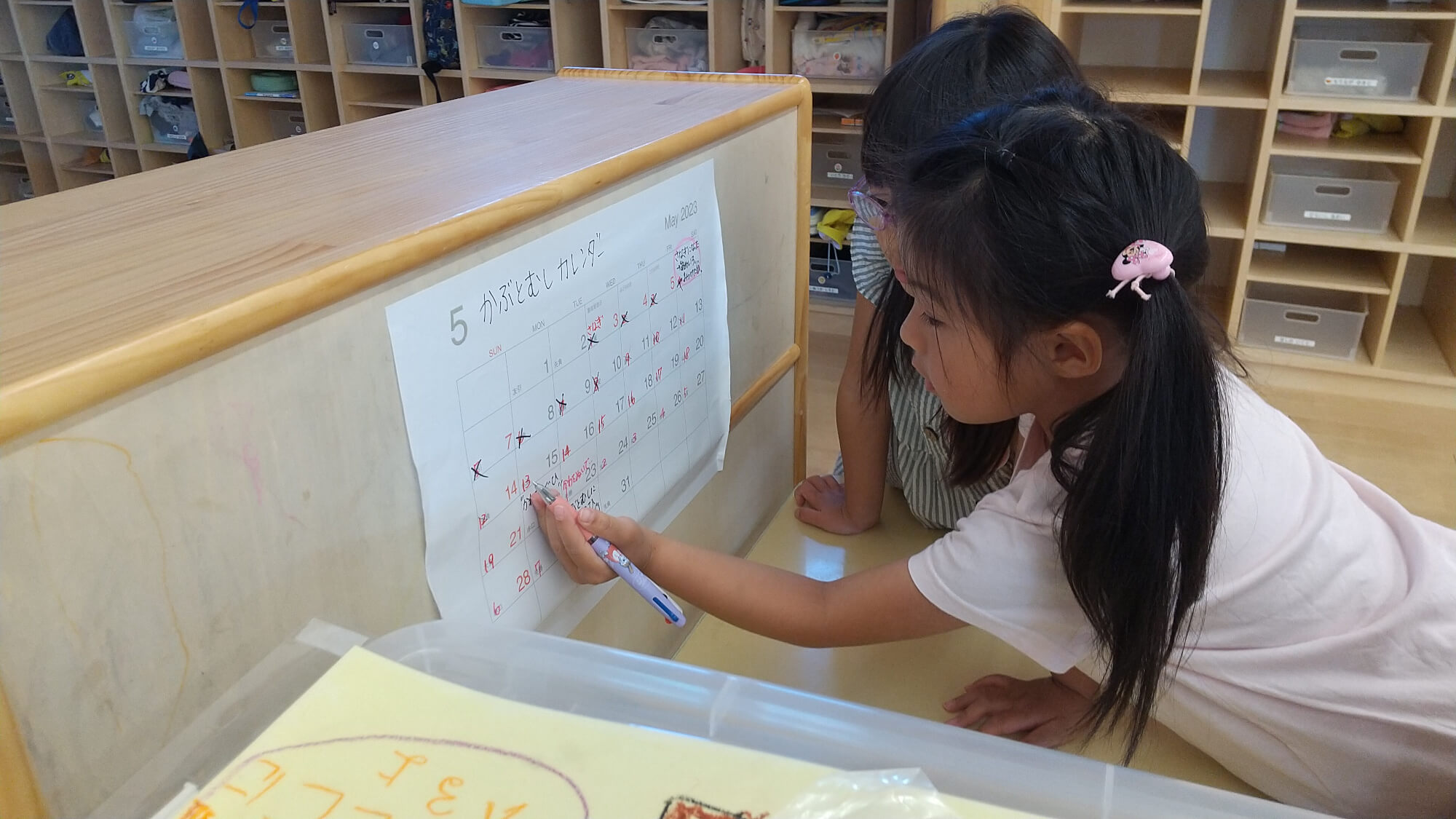 みんなで図鑑を見ながら、カブトムシカレンダーも作りました。毎朝カブトムシの様子を確認した後、「さなぎになった日」→「さなぎからかわを脱ぐ日」→「カブトムシになる日」を楽しみにカレンダーに印をつけています。カブトムシになる日ももうすぐです。皆で楽しみにしたいと思います。