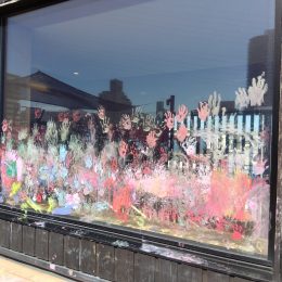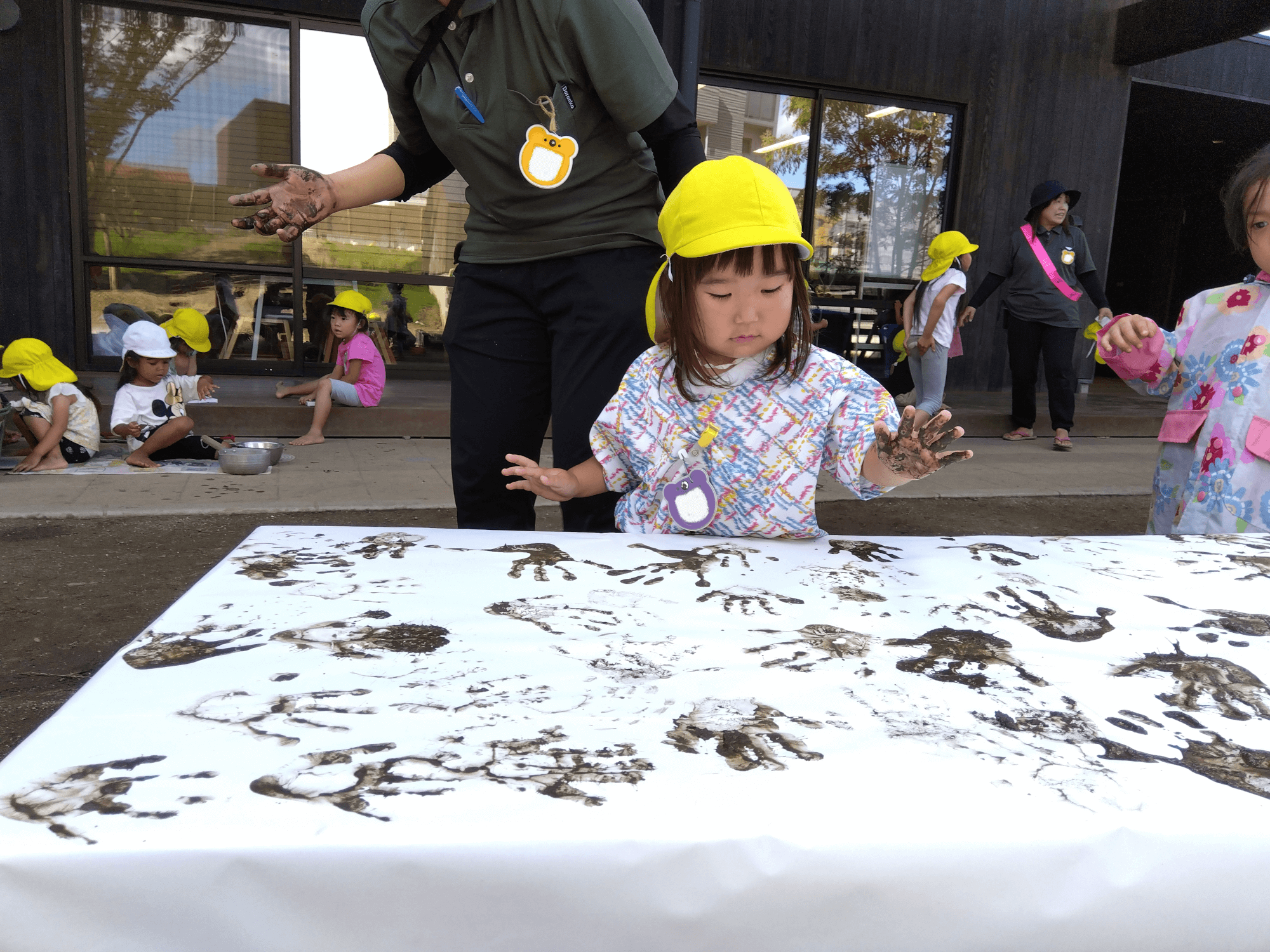 お祭りの看板も、子どもたちが大好きなどろんこあそびをヒントにして、今年はどろんこの手形を押してもらいました。幼児クラスの子が手形を押していると小さな子も一緒に手形押しを楽しんでいましたよ。