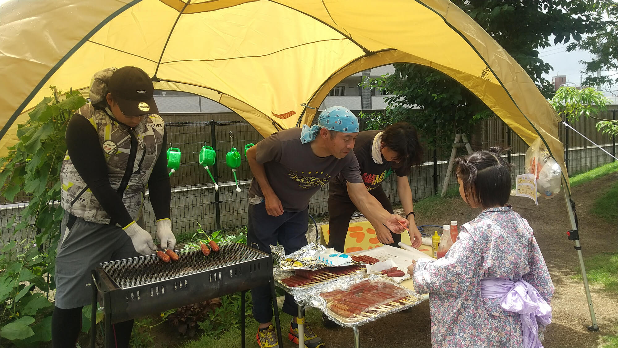 大人気のフランクフルトのブースでは暑い中、火起こしから販売までのお手伝いをしていただきました。手際よく火起こしをされる姿に感動しました。どんどん行列ができましたが、サポーターズの方々が協力しながら焼いて、販売していただいたおかげで大盛況でした。