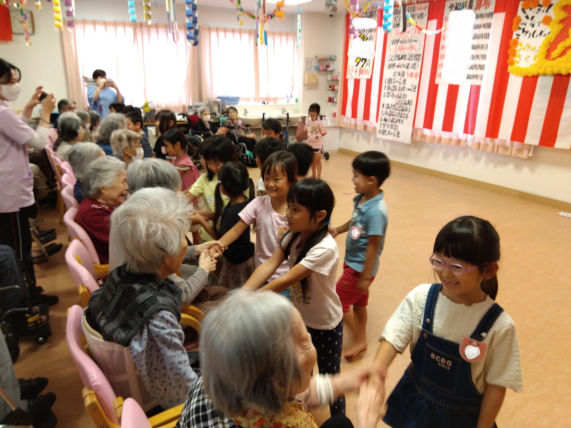 最後に施設の方と握手をすると「子どもたちから沢山元気をもらいました。ありがとうございます。」と涙を流される方もいて、子どもたちの笑顔がおじいちゃん・おばあちゃんの力になってくれたようです。