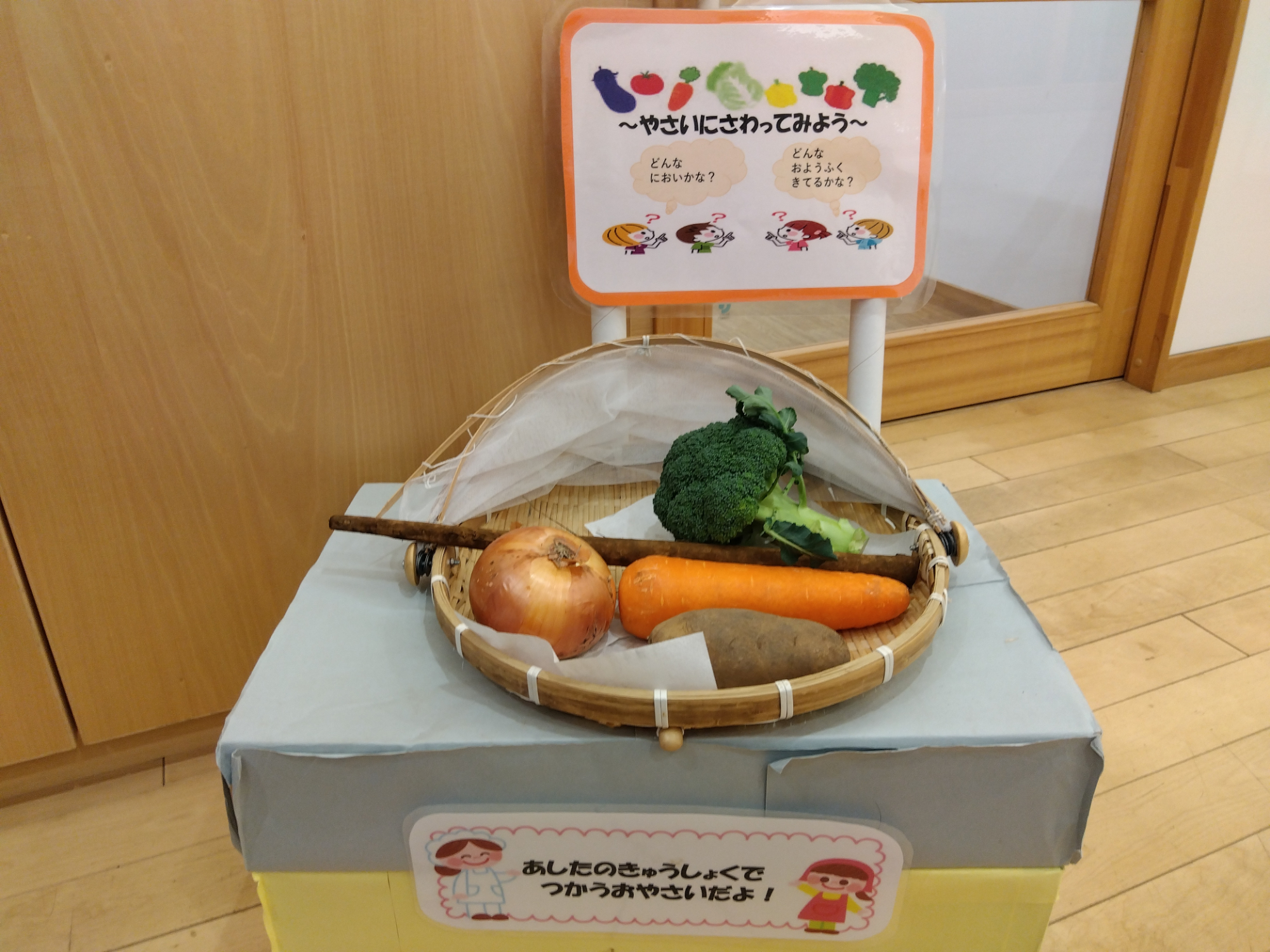 玄関に次の日の給食で使用する野菜を展示することになりました。畑で野菜は育てていますが、親子で野菜を触ったりにおいを嗅いだりして、会話を楽しんで欲しいという給食の先生たちのアイディアでスタートしました。