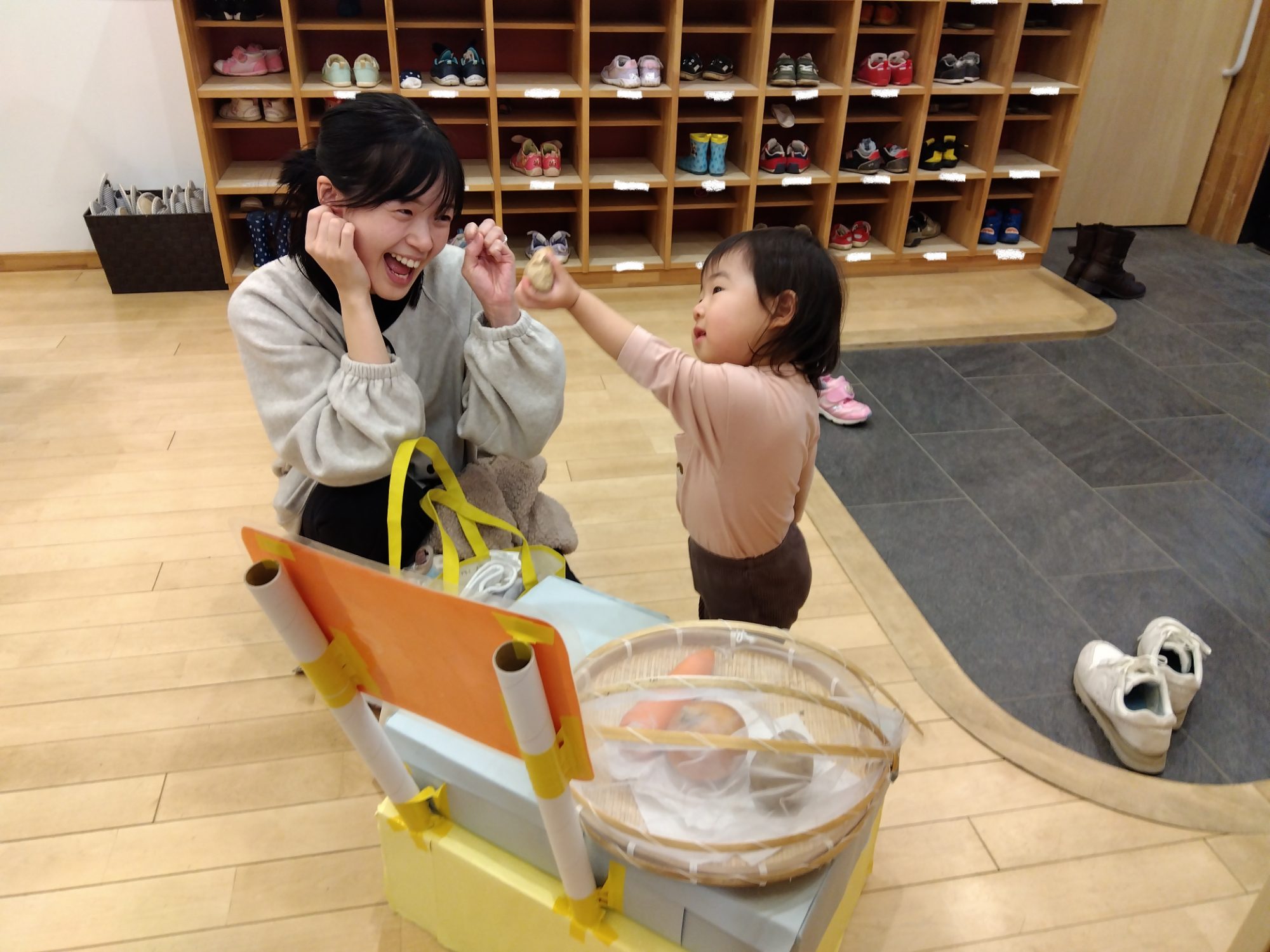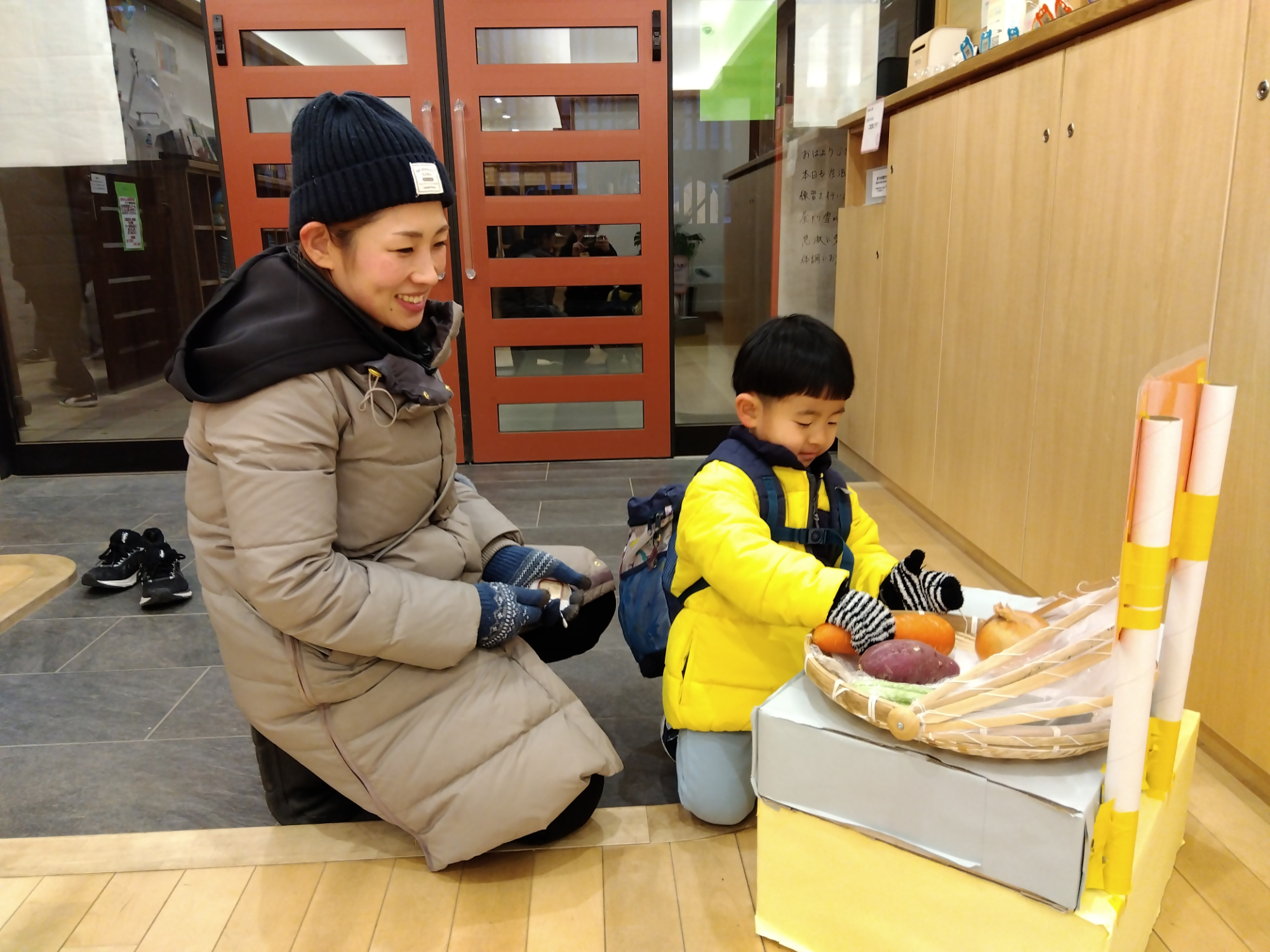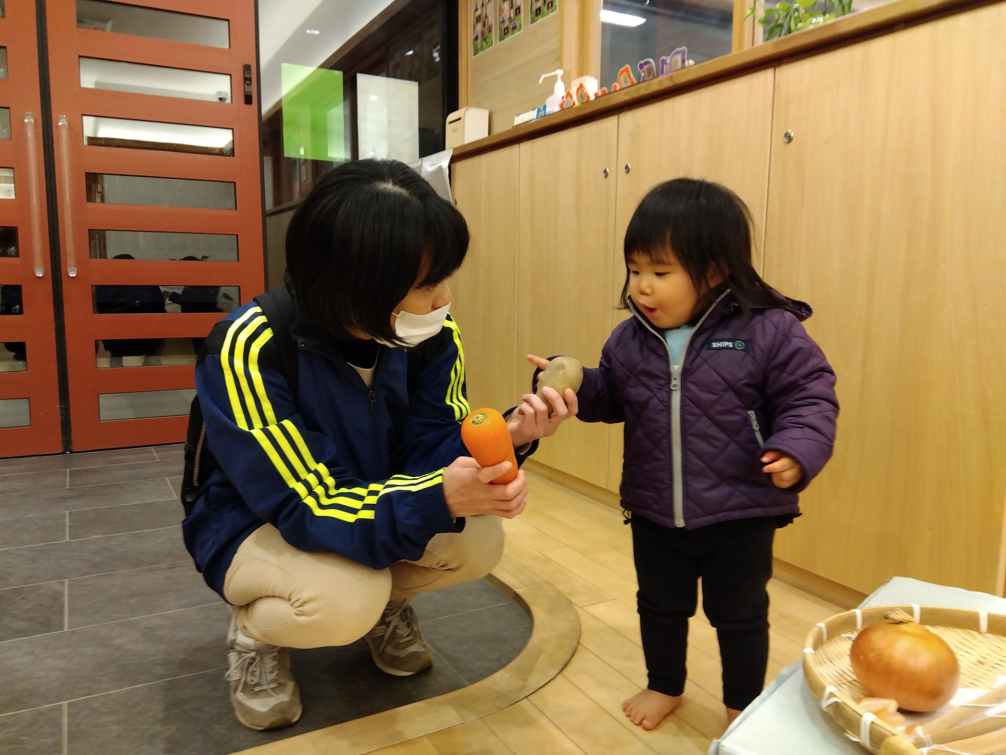 初めは野菜に気づかず帰ってしまうことも多かったのですが、日に日に野菜の存在に気づいてくれるようになりました。 玄関に来ると、真っ先に野菜を手にして触る子が増えてきました。あわ組さんは野菜をお母さんに渡して得意顔です。お母さんも「これはショウガだよ」と手渡された野菜の名前を丁寧に教えてくれています。