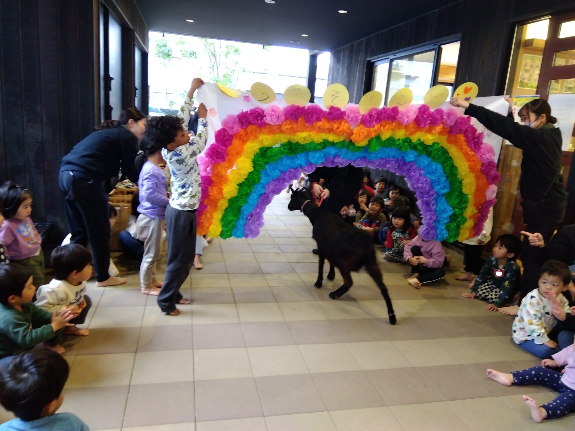 「あと10分でもこちゃん到着します」と連絡が入ると子どもたちはワクワクした表情でお出迎えの準備をしていました。到着して大きな歓声と拍手でお出迎えしたのですが、ヤギがビックリして門から入って来れなくなってしまったので、小さな拍手で迎えることになりました。準備した虹のトンネルも潜ってくれて子どもたちも嬉しそうでした。