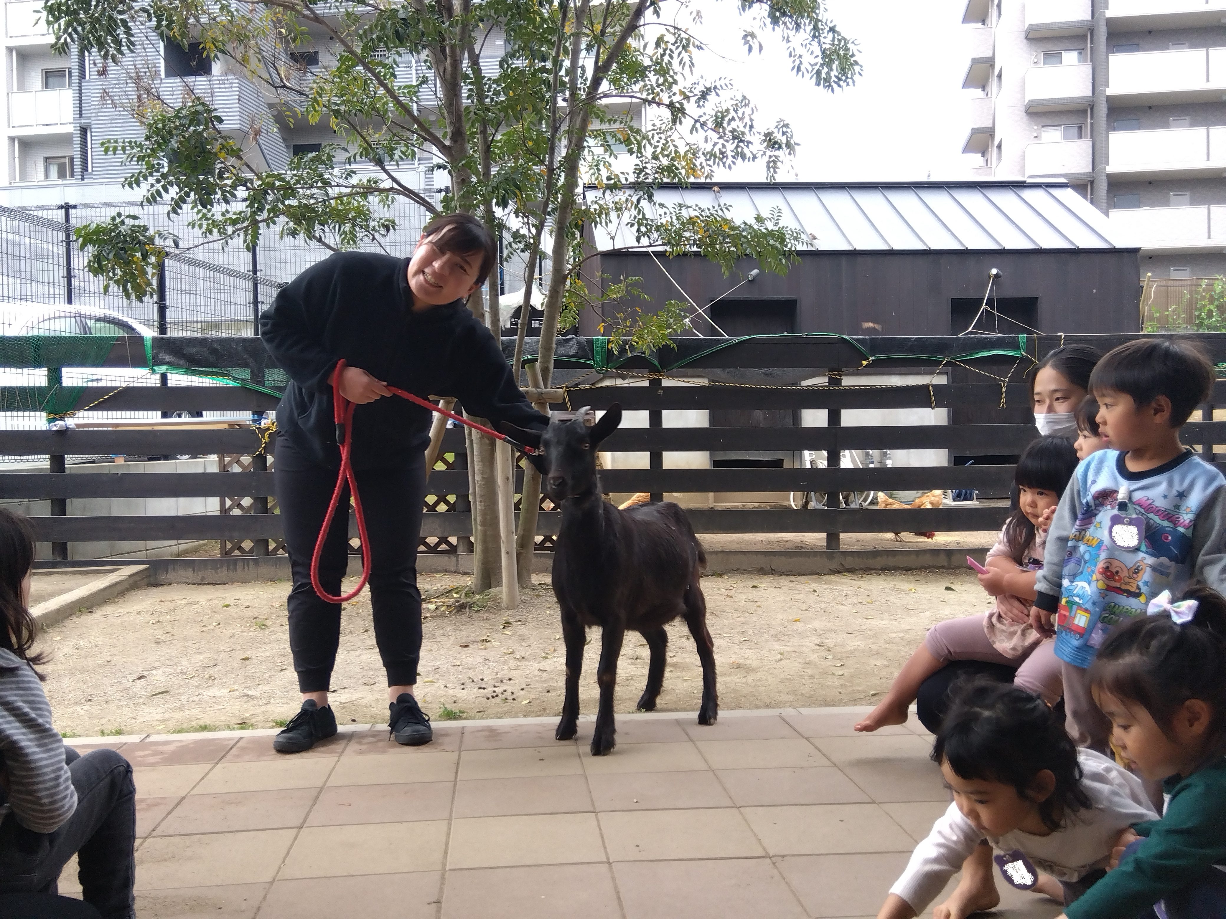 春日どろんこ保育園の先生がヤギを紹介してくれたり、触り方を教えてくれたりして、子どもたちは興味津々で聞き入っておりました。「ちょっとこわい」という子もいましたが、「かわいい」と言いながら触る子も多くいました。