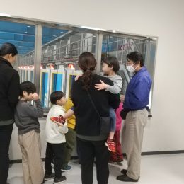 スイミングの先生の案内で施設の中を案内してもらいました。受付の方のお仕事を聞いてみると「電話を取ったり、水着の注文をしたりしています」と教えてくれました。受付の方と顔見知りの子も多く手を振って楽しそうにしていました。