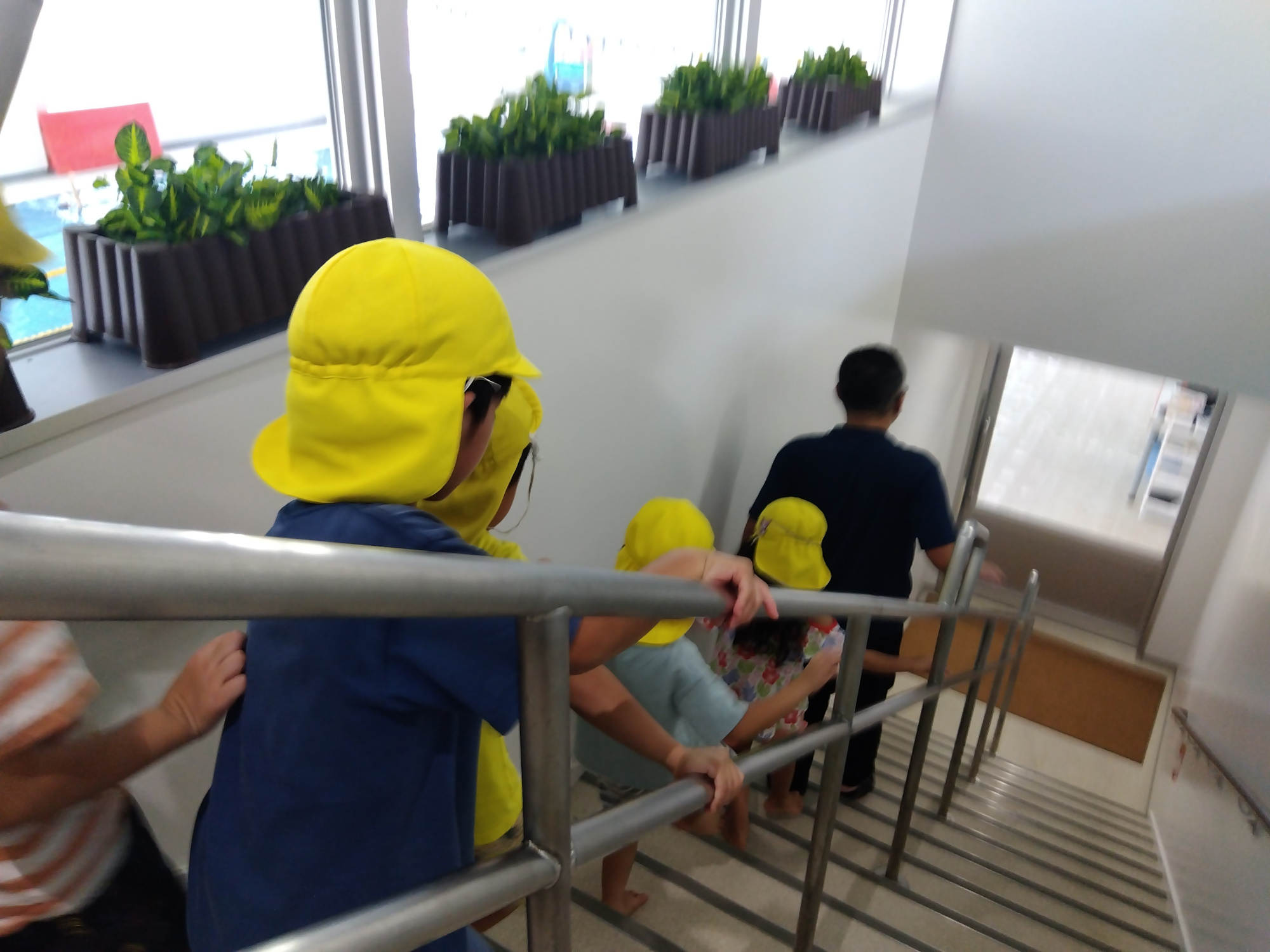 先生について階段を下りるとお待ちかねのプールです。ドキドキワクワクした表情で階段を下りていました。