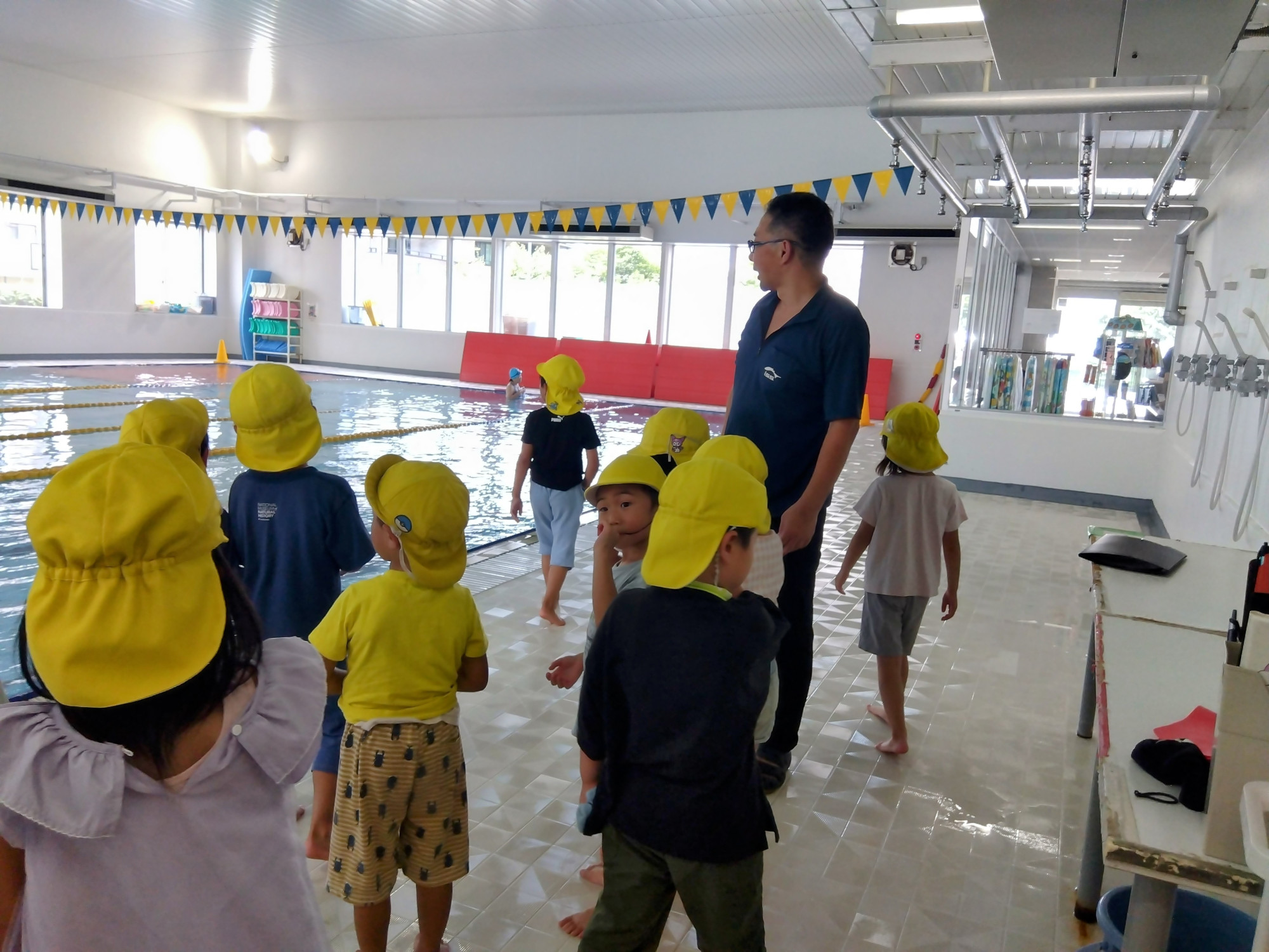 広いプールを見て嬉しくて仕方ない様子で「泳ぎたいな」「プールの中を歩いてもいいの?」「今日は子どもいないの?」と感じたことを次々に質問し、そっとプールの水を触ってみる子もいました。