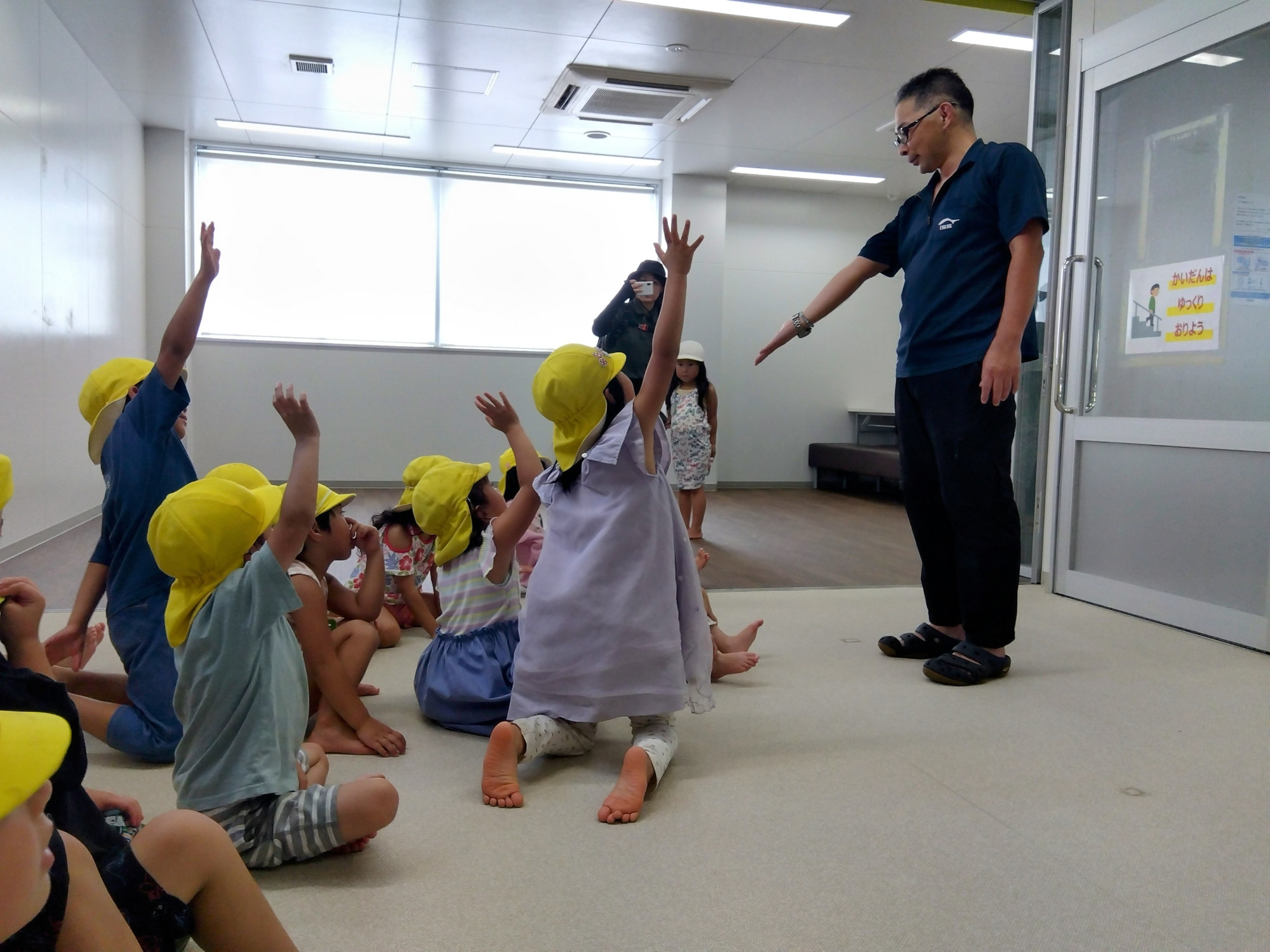 最後は質問タイムです。手を挙げて次々に質問していて、中には「どうやったら溺れないで泳ぐことができますか?」と質問する子もいました。「良い質問をするね!バタバタしてしまうと溺れてしまうので静かに上を向いて浮かぶと溺れにくいです。」と教えてもらい、子どもたちも納得の様子でした。