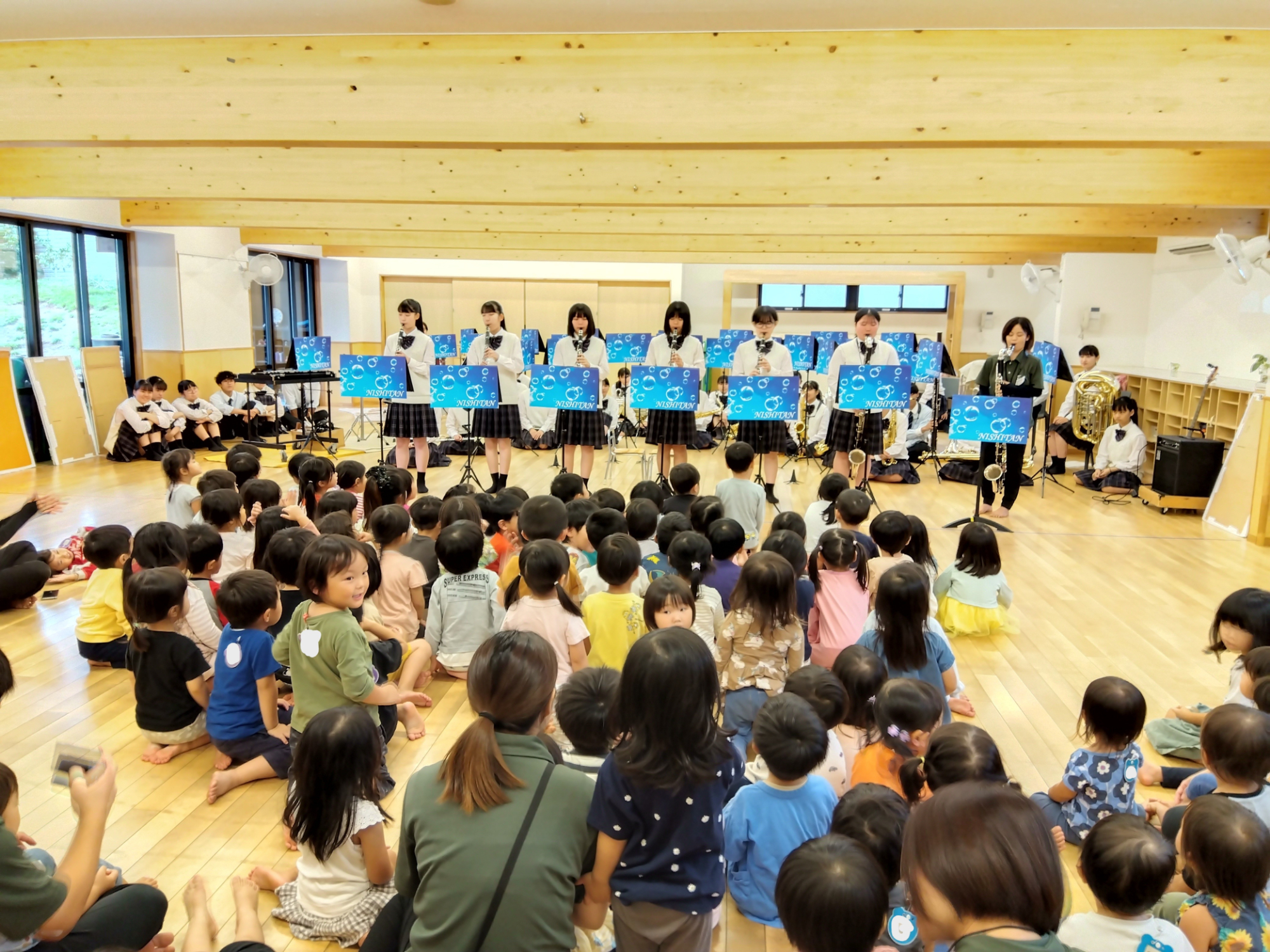 今回は、この吹奏楽部の卒業生が三筑どろんこ保育園の職員として働いているというご縁もあり、来ていただけることになりました。オープニングでは、卒業生の職員も高校生に混じって一緒に演奏をしました。0から5歳の子どもたちが集まり、みんなとても熱心に演奏を聞いていました。