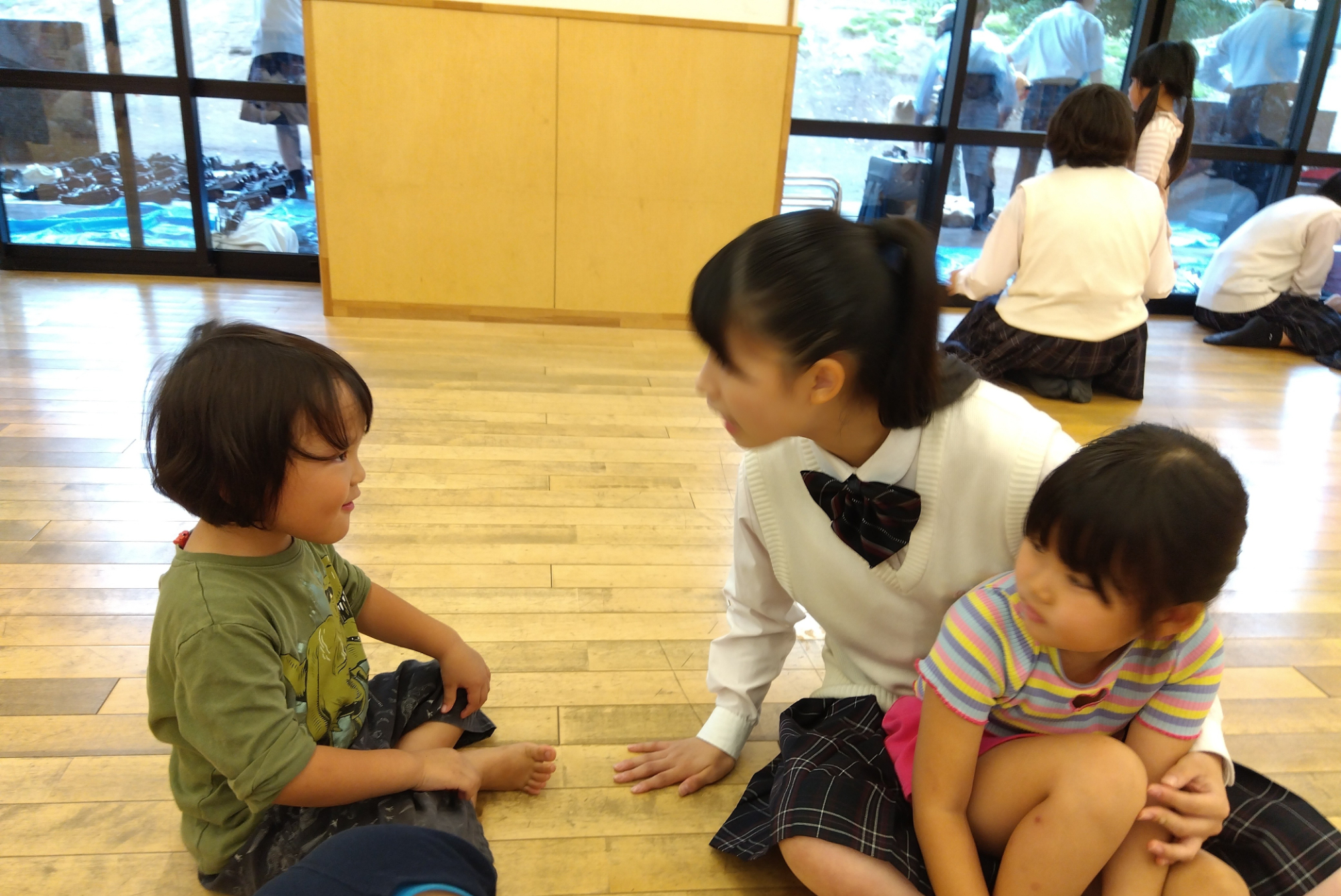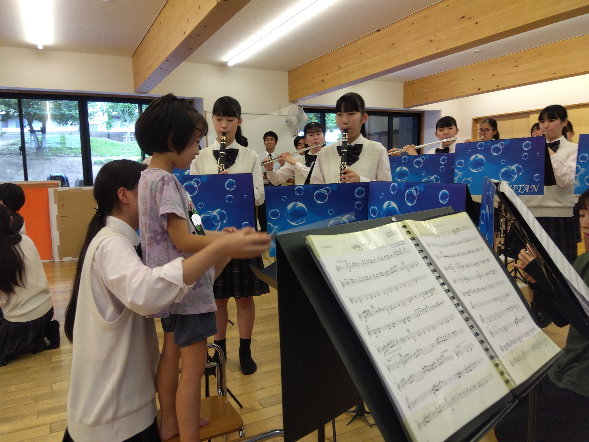 演奏会が終わった後は、触れ合いの時間もありました。普段はなかなか関わることの出来ない高校生のお兄さんお姉さんたちとおしゃべりしたり抱っこやおんぶをしてもらったりし、とても嬉しそうでした。